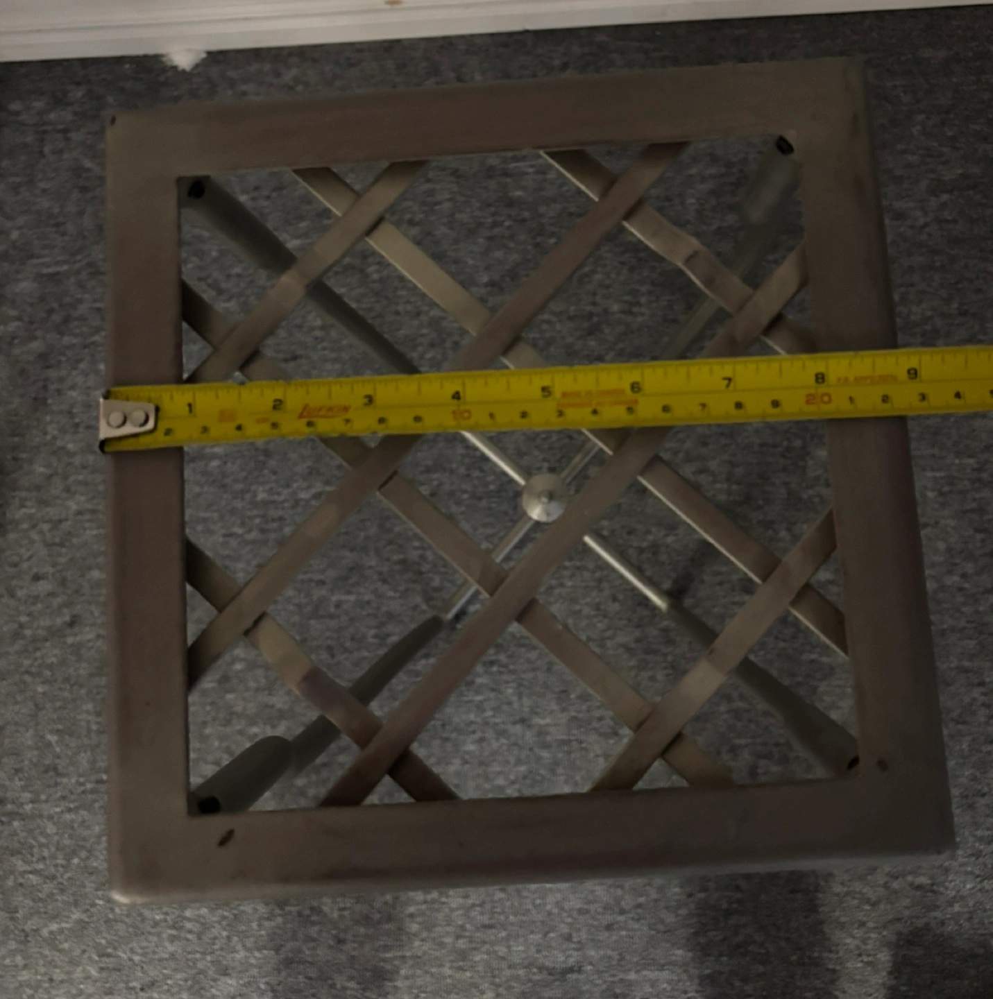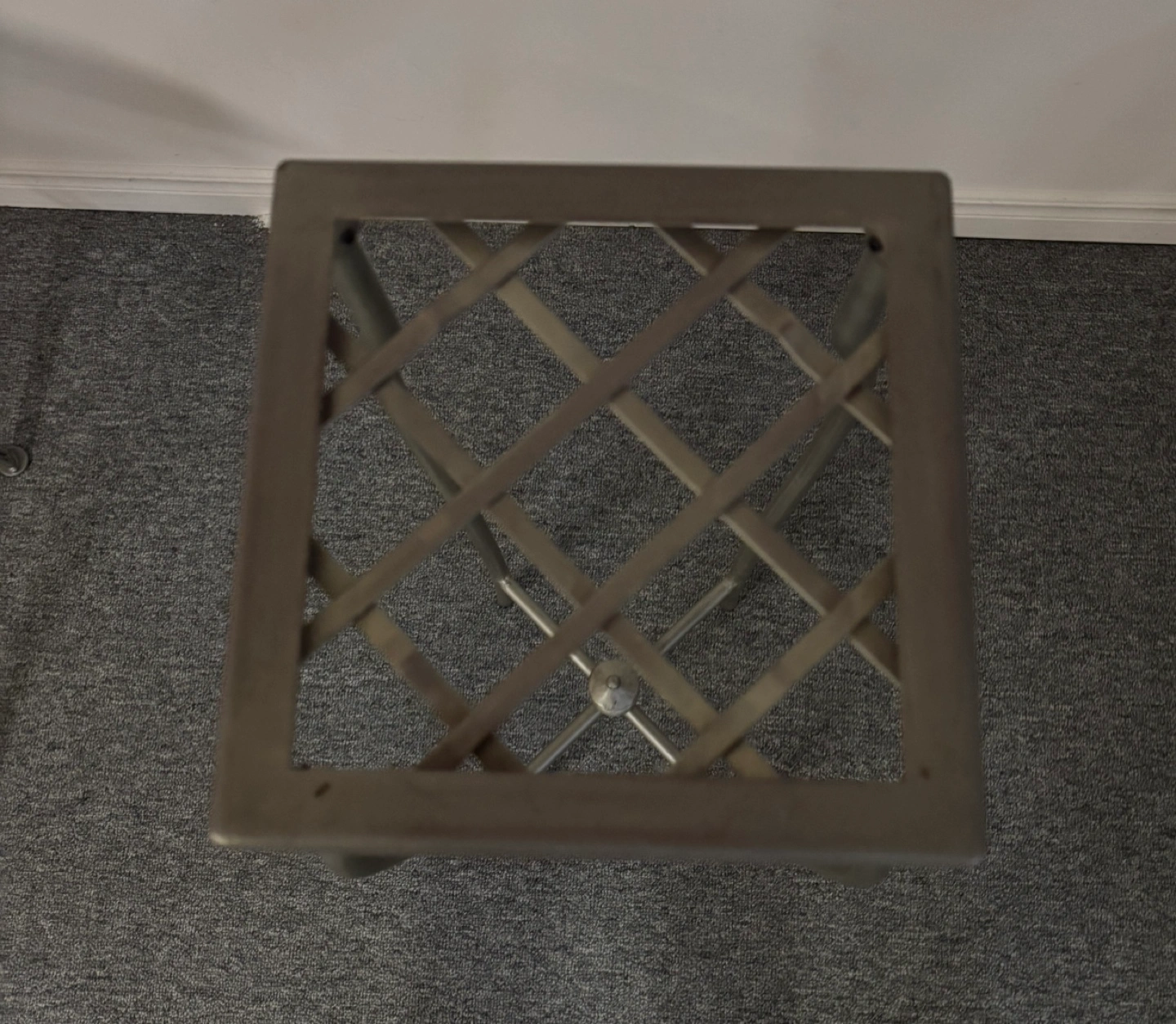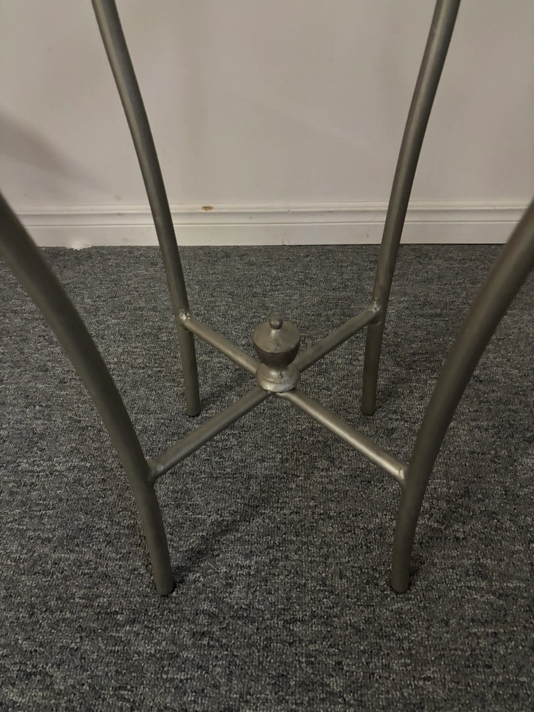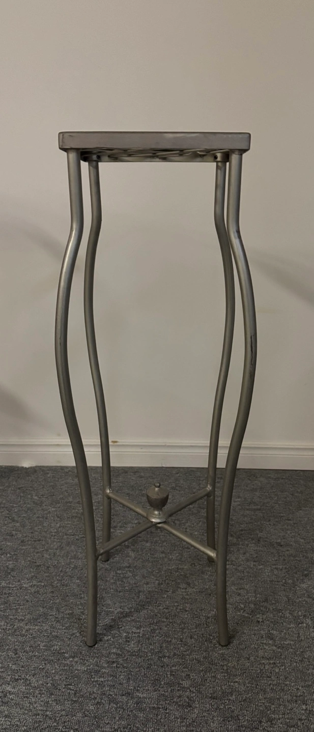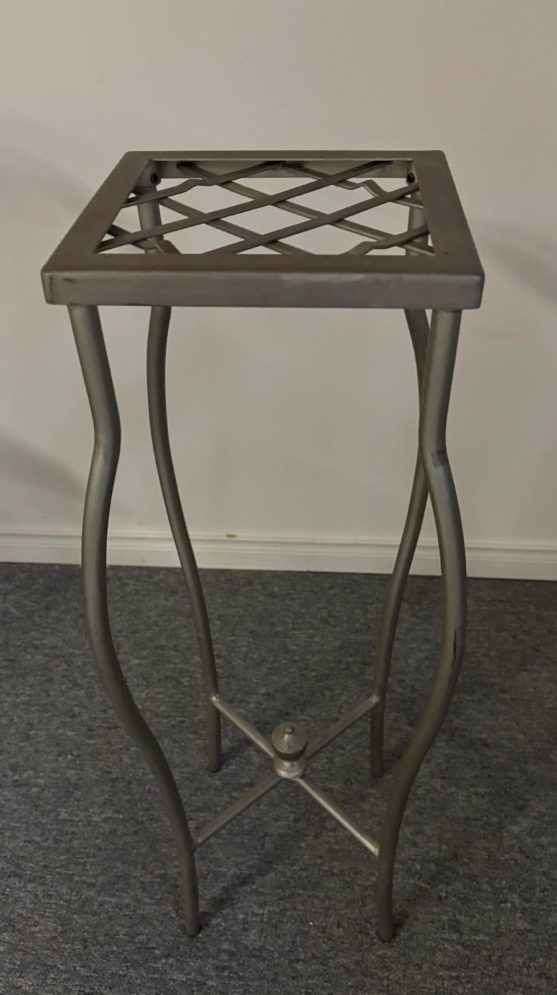 Small metal plant stand. Distressed silver finish. Beautiful design - curved legs and lattice top. A beautiful accent piece Pick up and cash only pls