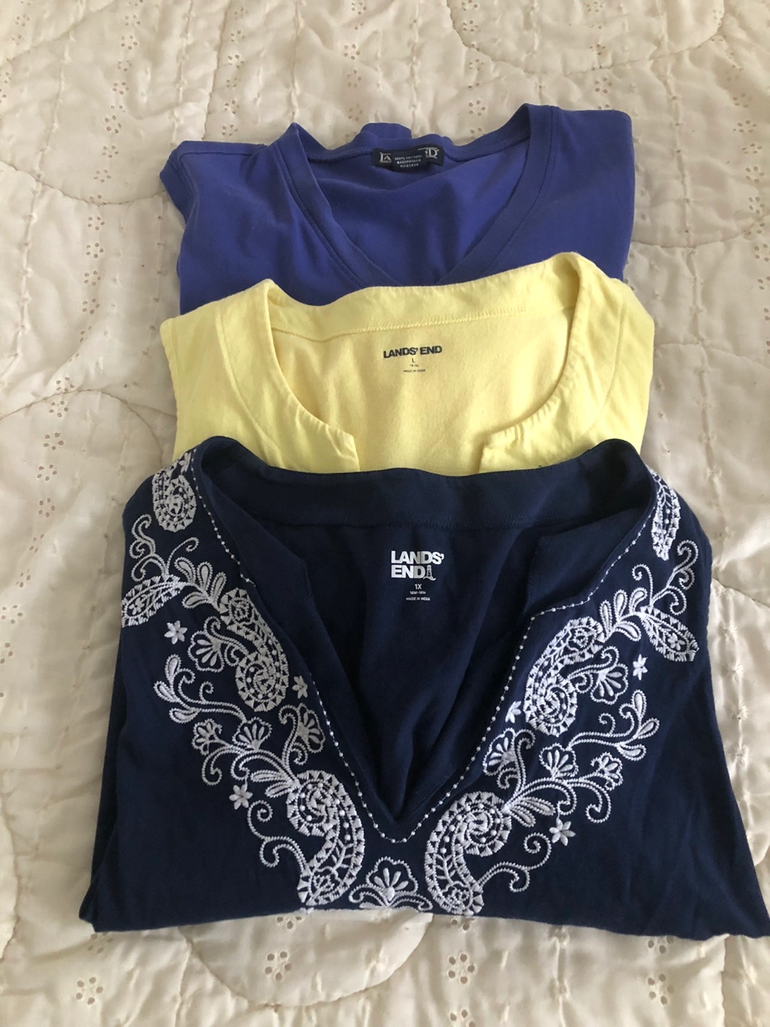 Three lounge wear dresses from Lands End. Sleeveless with pockets. Great for summer or if you’re headed south for the winter. Lightly worn. Good condition. Navy blue with embroidery 1X, Orange/Yellow ombre L, Purple 2X. Yonge/Davisville pick up.