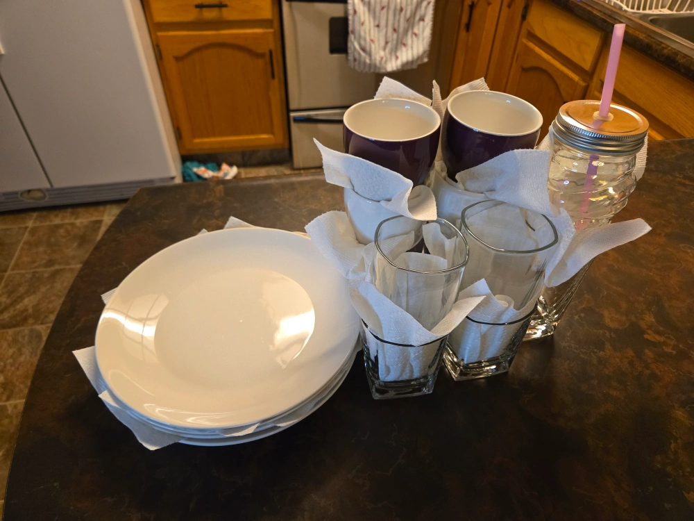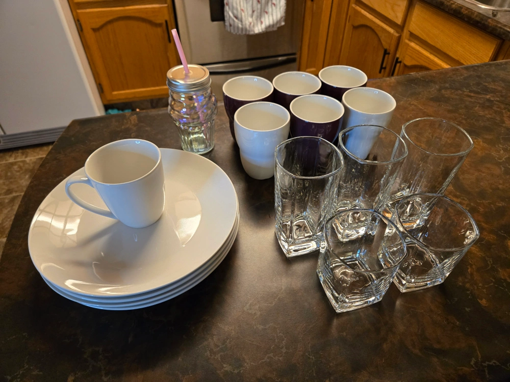Tableware Starter Set – Lightly Used & Stylish Moving out on your own or setting up a new home? This package is perfect for anyone who wants quality and style without breaking the bank. Includes: 6 Starbucks Double-Wall Tumblers (Purple/White) – Durable and perfect for hot or cold drinks. 5 Le'raze Glasses – Stylish squared design for everyday use or entertaining. 4 Gibson Home Plates + 1 Coffee Mug – White, modern, dishwasher and microwave safe. 1 Mason Jar Cup (Ice Cream Design) – Fun and unique, with a straw included. All items are lightly used, in excellent condition, hand-washed before packaged and ready to go! Perfect for students, new renters, or anyone upgrading their setup. Pickup in Red Deer or delivery available for $10. Payment: Cash or Etransfer.