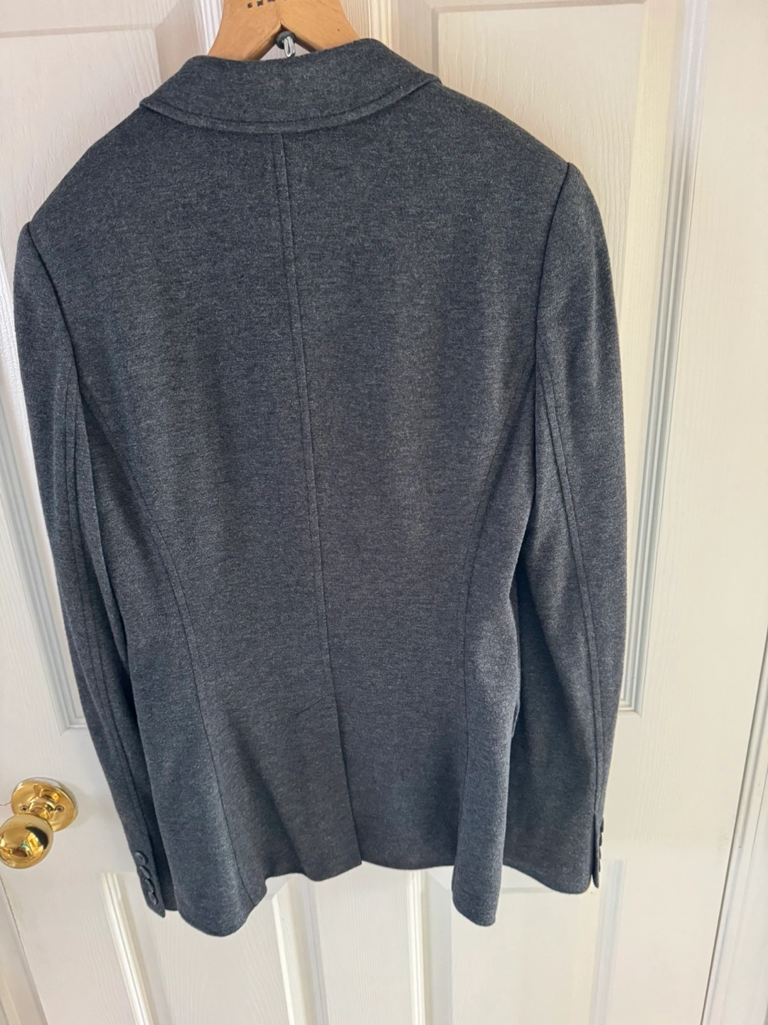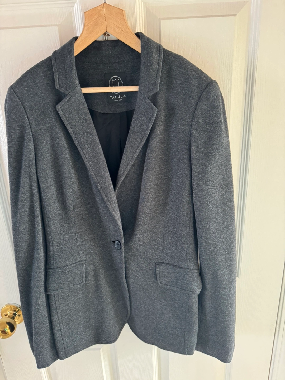 Women's charcoal grey blazer. One button closure. Long sleeves. Perfect for work or a night out.