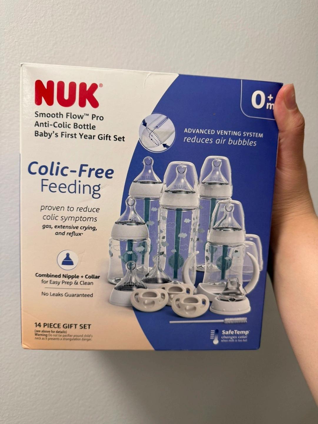 NUK Smooth Flow Pro anti-colic bottles. 14 piece gift set includes bottles, nipples, and pacifiers. Advanced venting system reduces air bubbles. Combined nipple and collar for easy prep and clean. No leaks guaranteed.