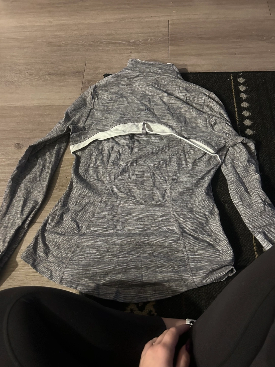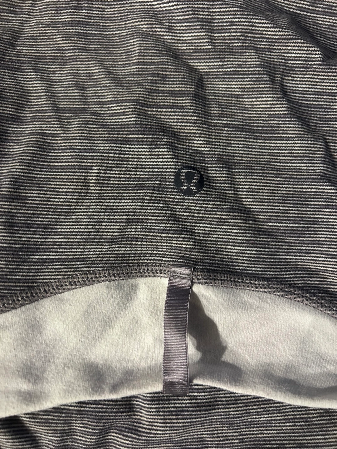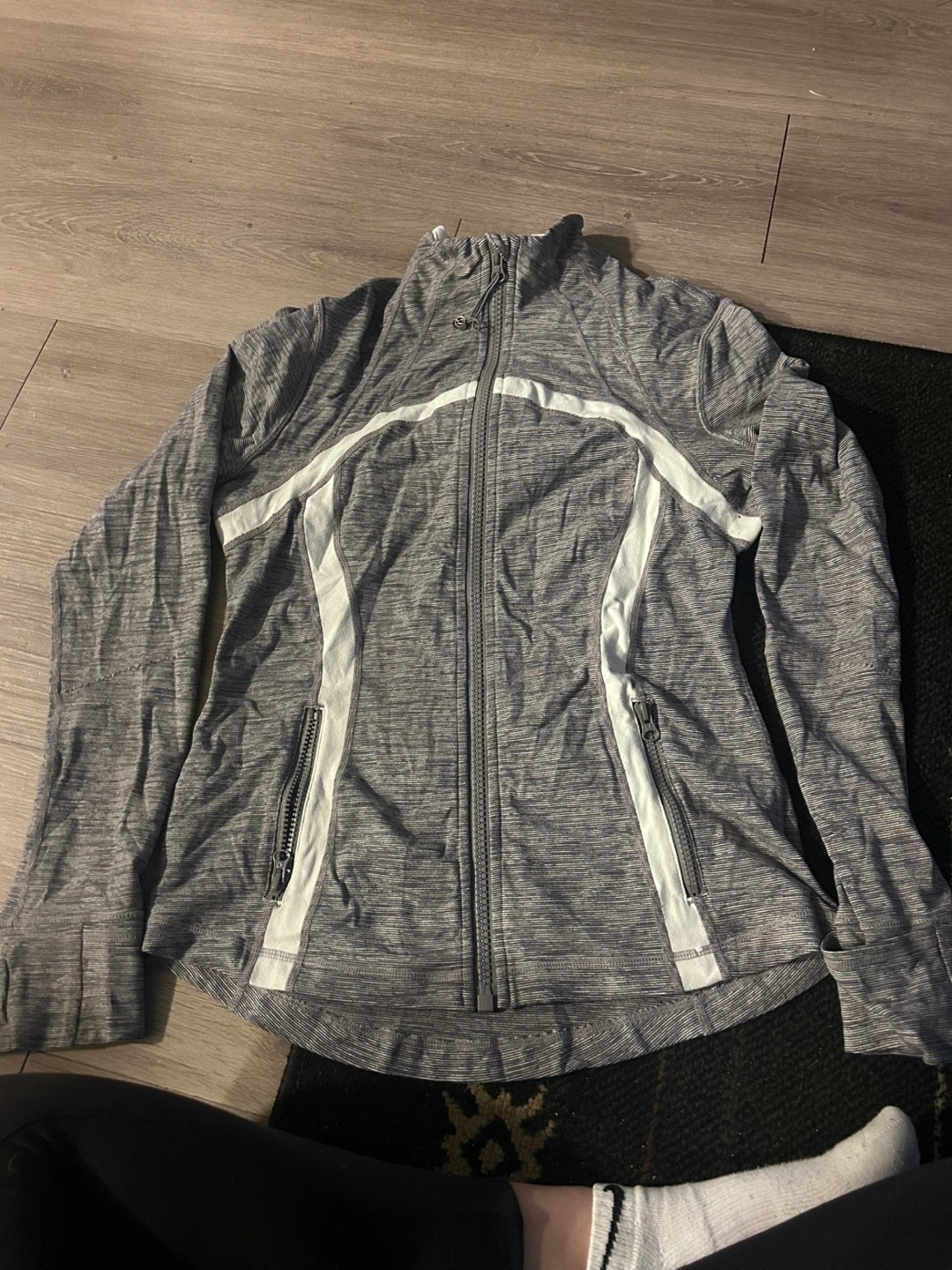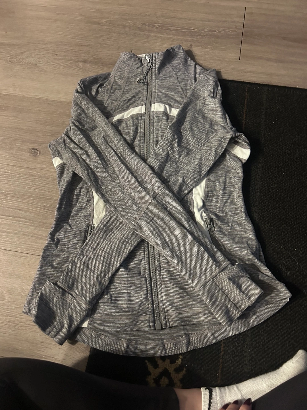 Grey and white striped long-sleeve zip-up. Features two zippered pockets. Excellent for layering.