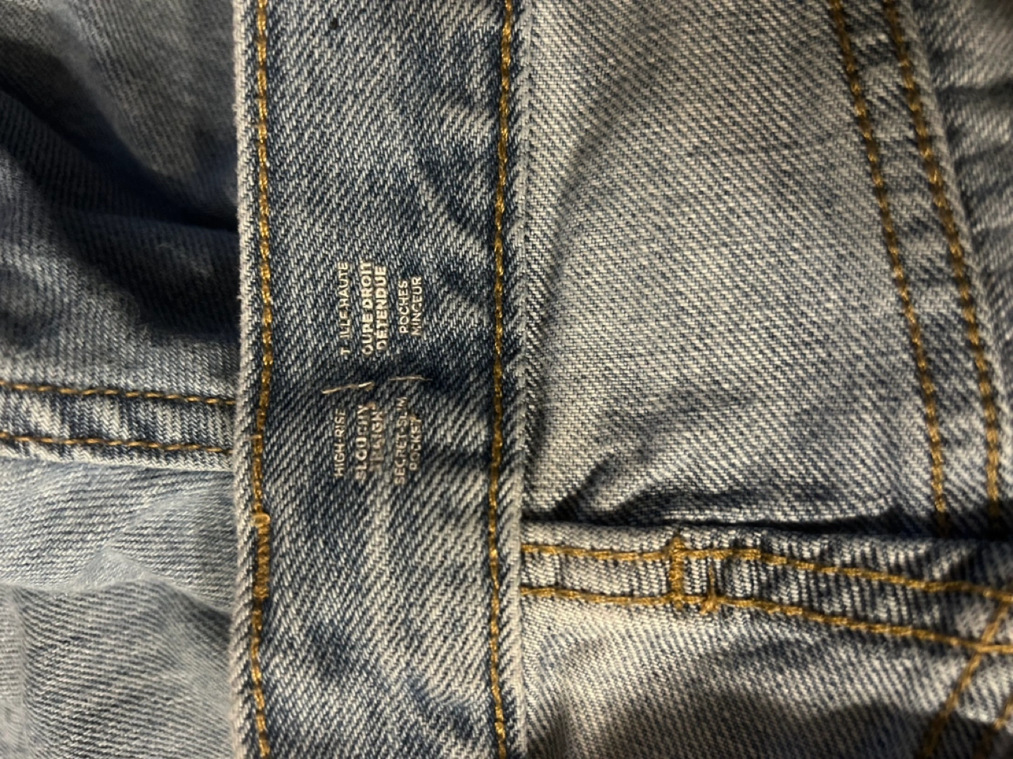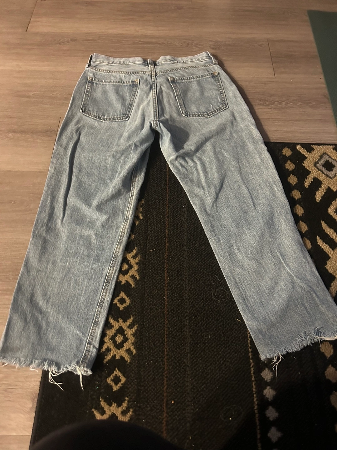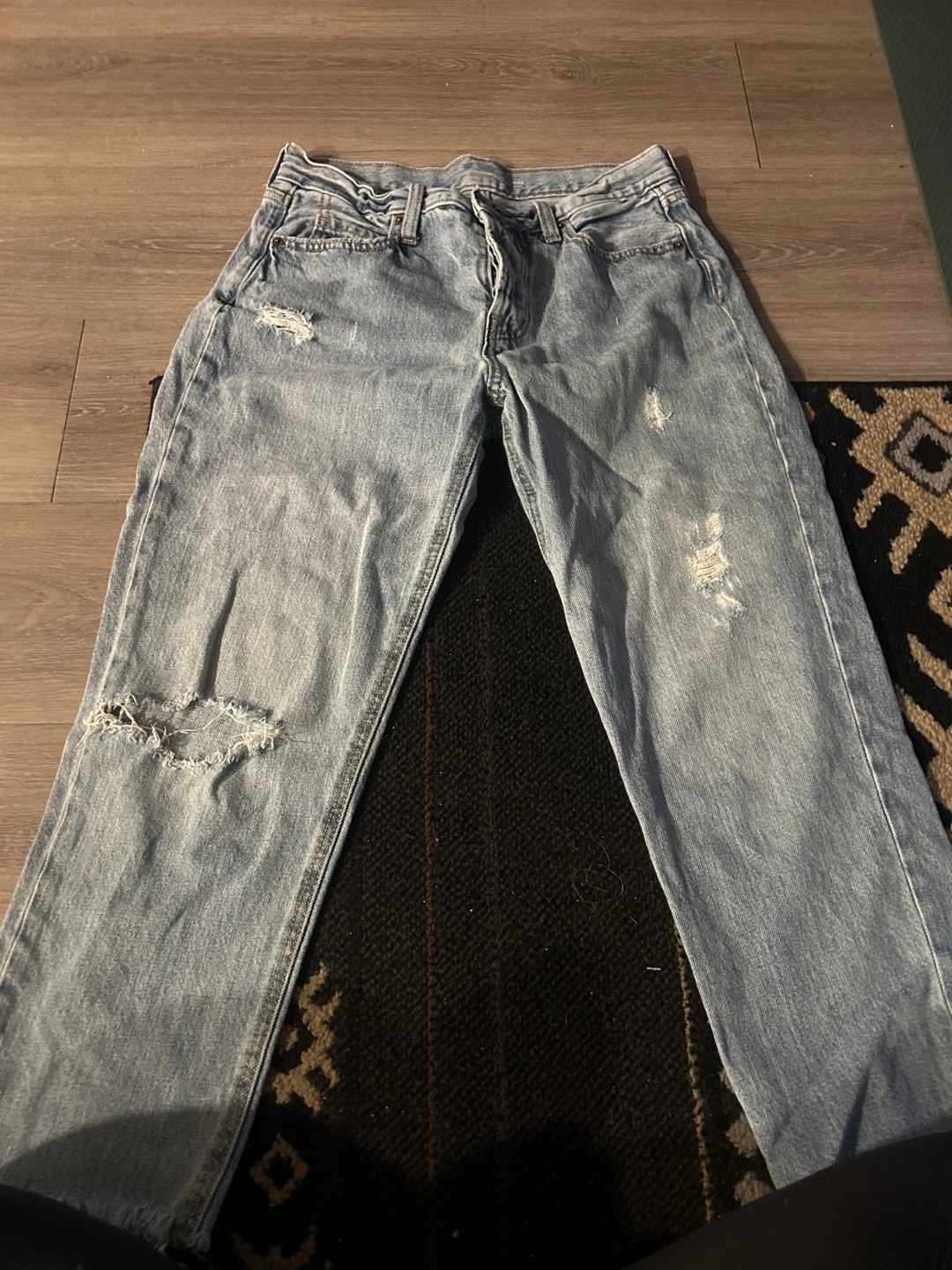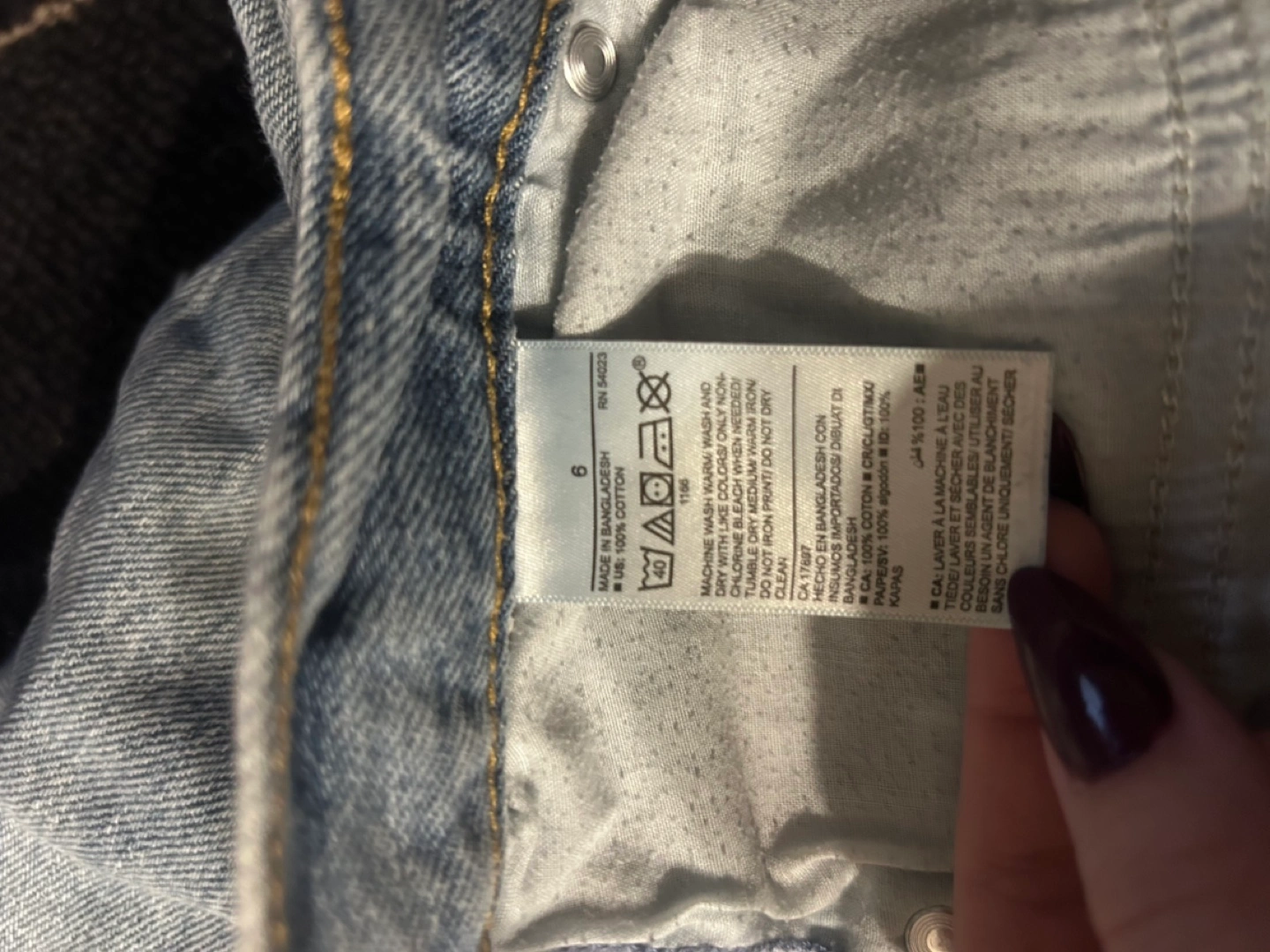 Light wash denim jeans. Distressed detailing. Straight leg. Size 6. Made in Bangladesh.