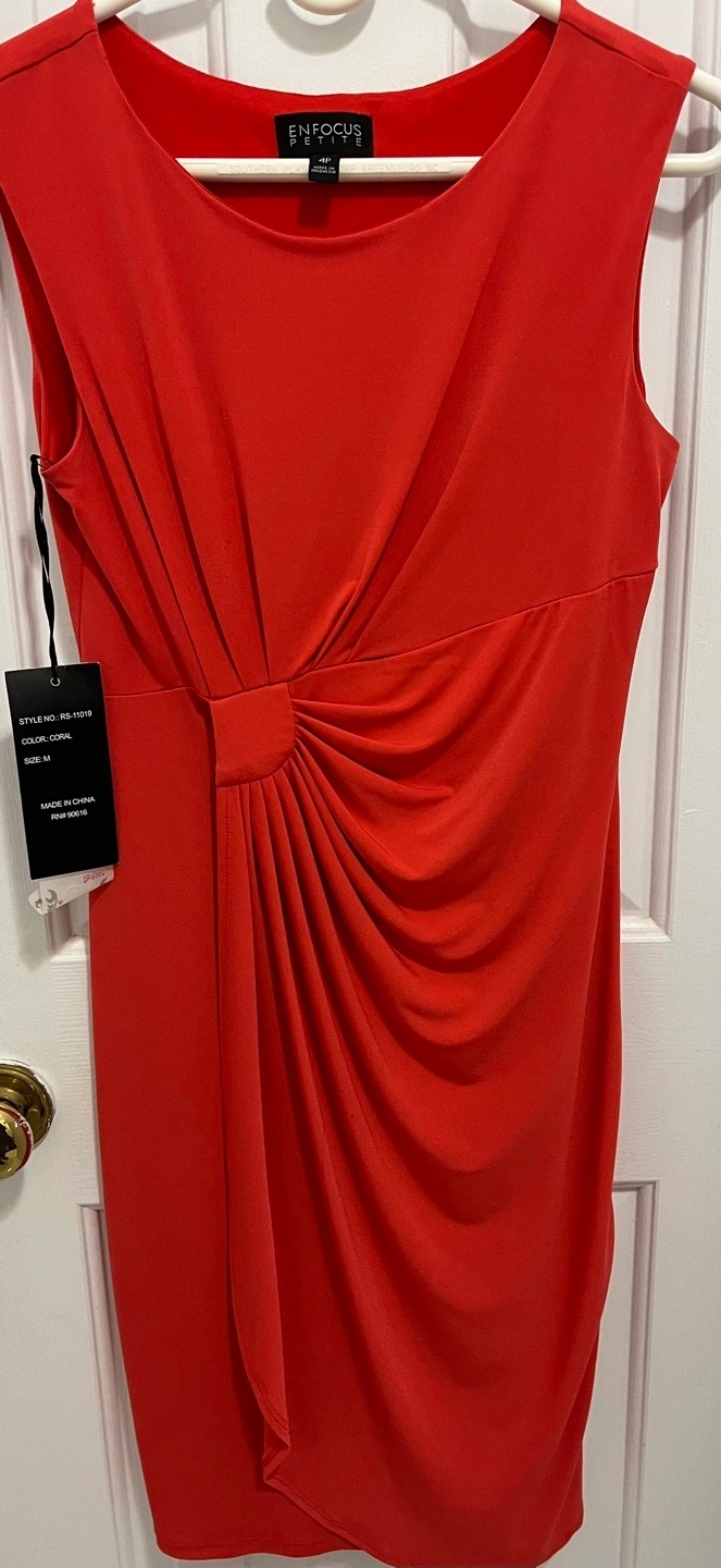 Stunning coral dress. Sleeveless, flattering fit. Knot detail at waist. New with tags. Pick up from Maple Vaughan. Major intersection keele and Rutherford or downtown Toronto.