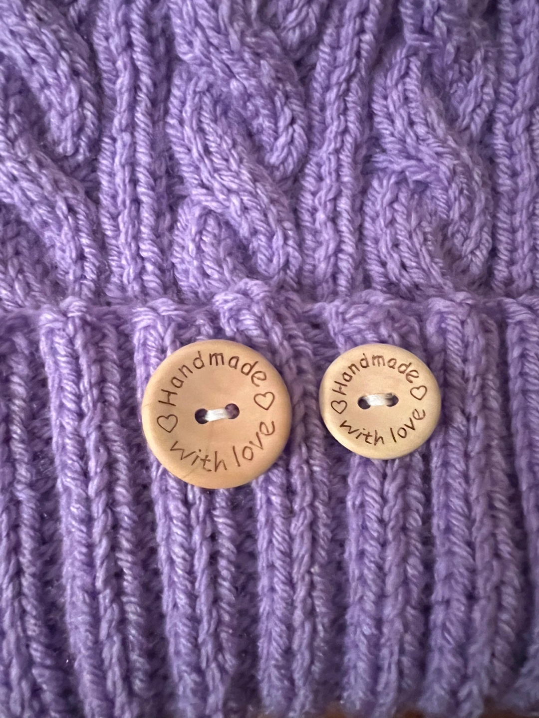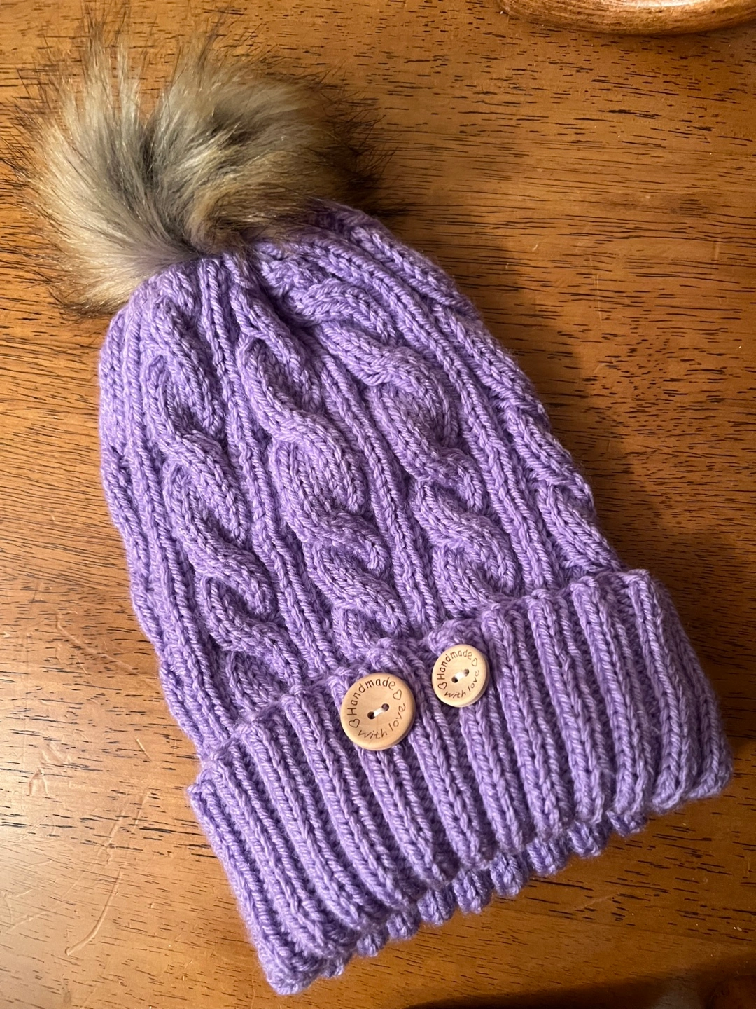 Lovely purple cable knit toque. Features a faux fur pom pom and 2 wooden buttons that says “Handmade with love”. ❤️❤️