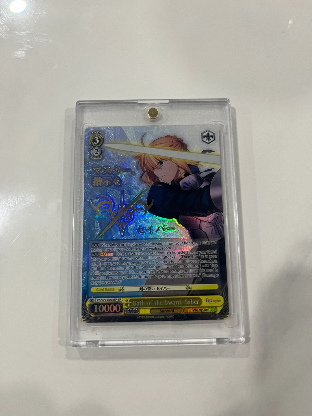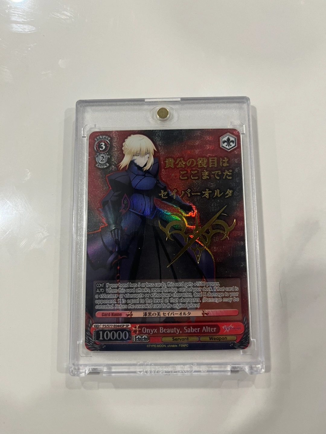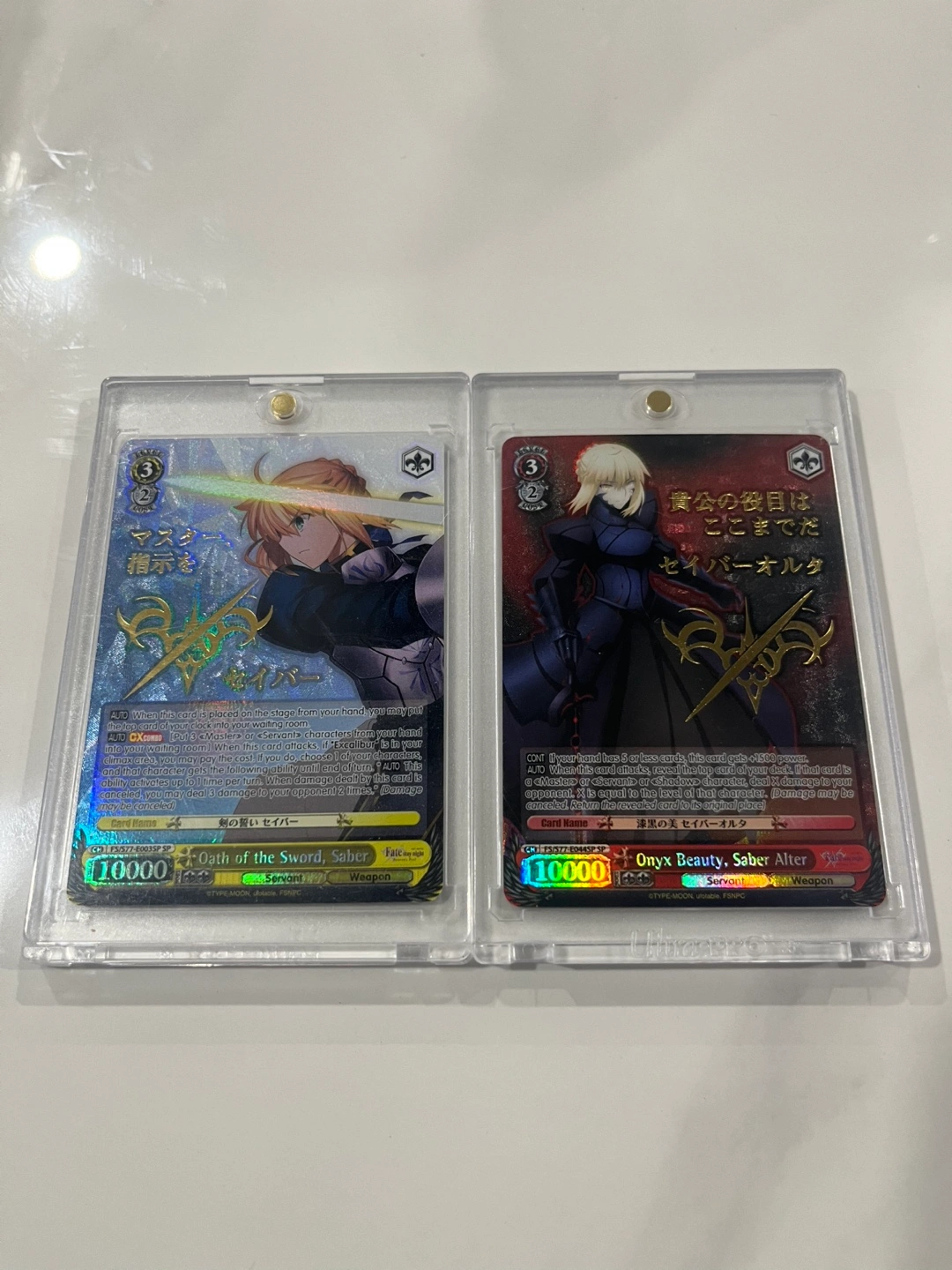 Fate/Grand Order Weiss Schwarz trading cards featuring Saber. Oath of the Sword, Saber $250 Mint Onyx Beauty, Saber Alter $150 Mint Entertaining trades in my favour.