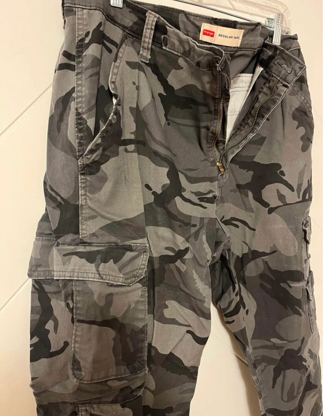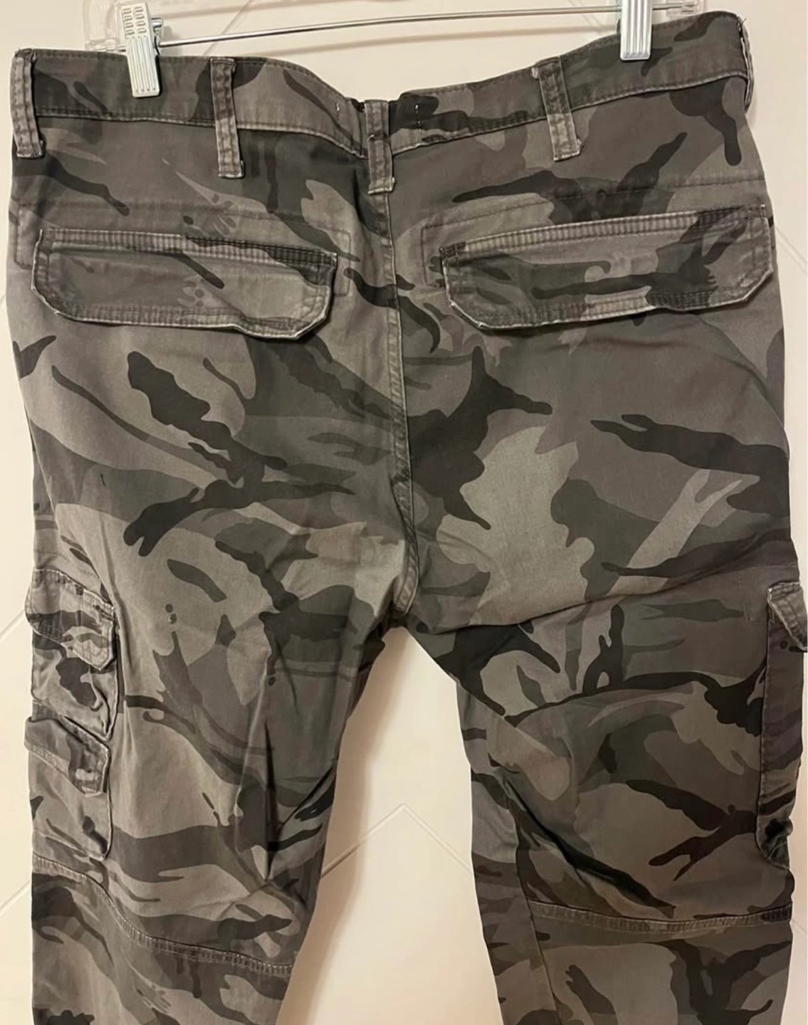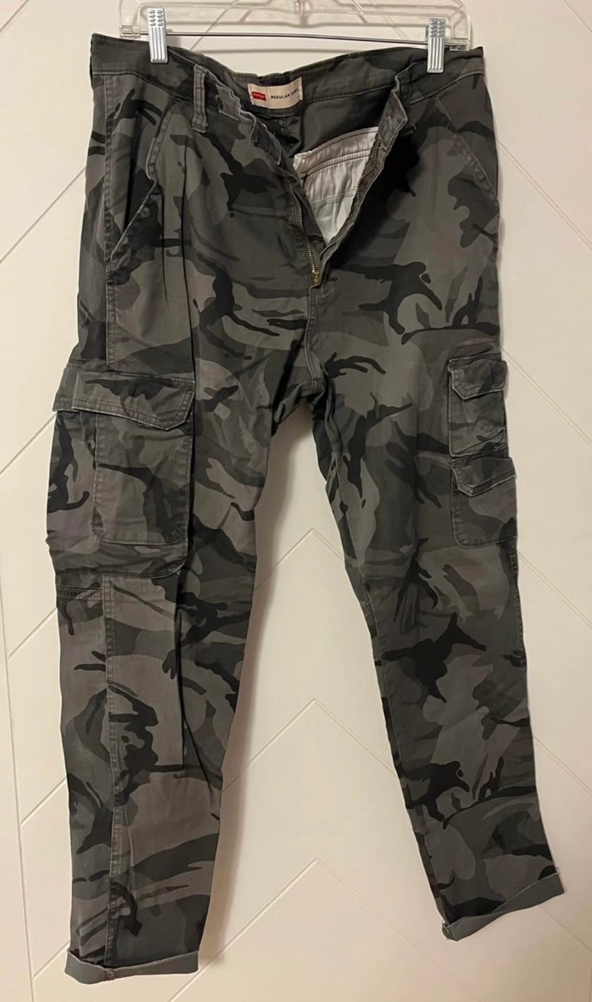 Men's regular fit cargo pants. Grey camouflage pattern. Multiple pockets. Zipper and button closure. Men Size 34x32 Only worn a couple of times, like new Pick Up Bloor and Islington Etobicoke