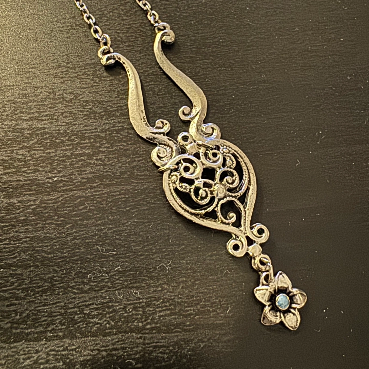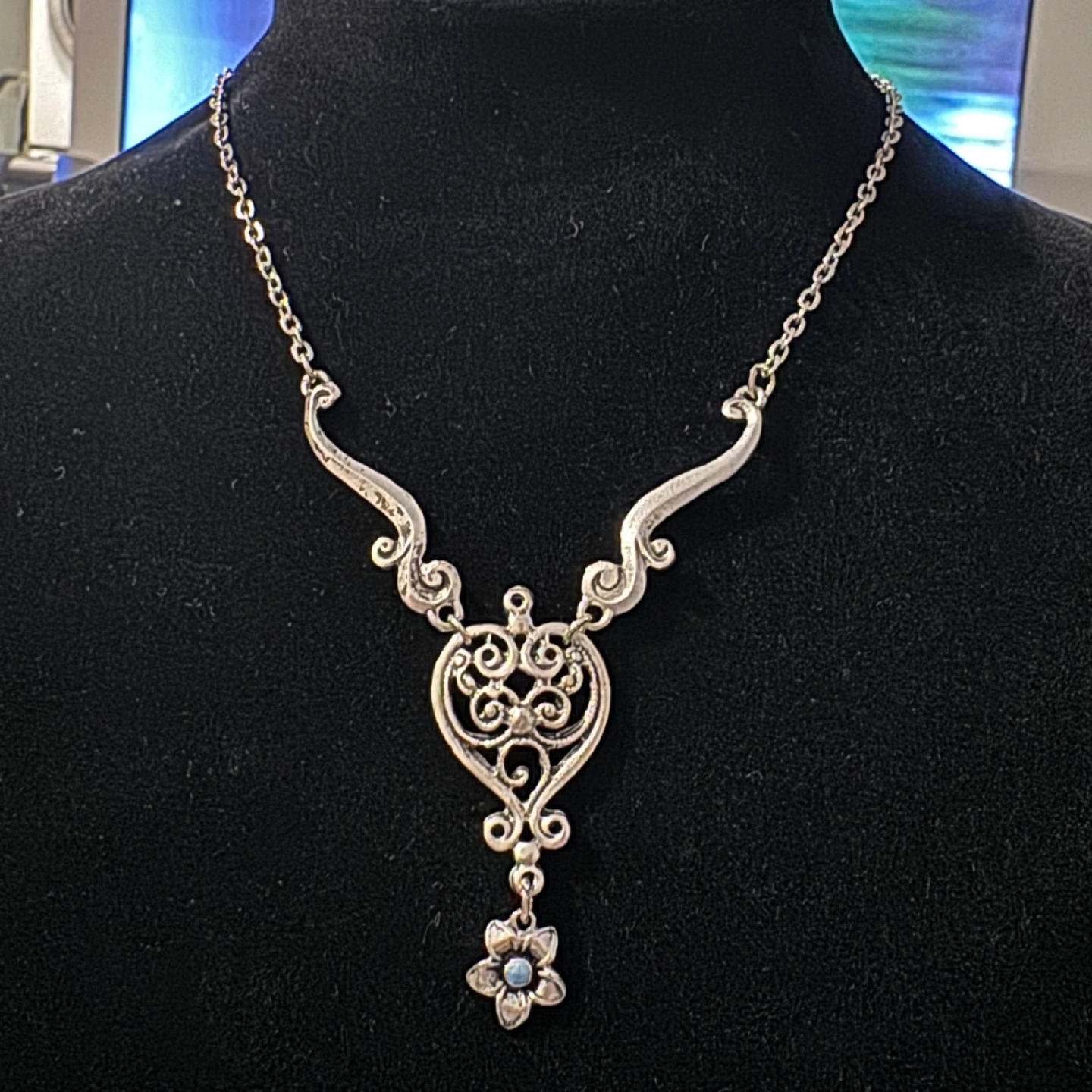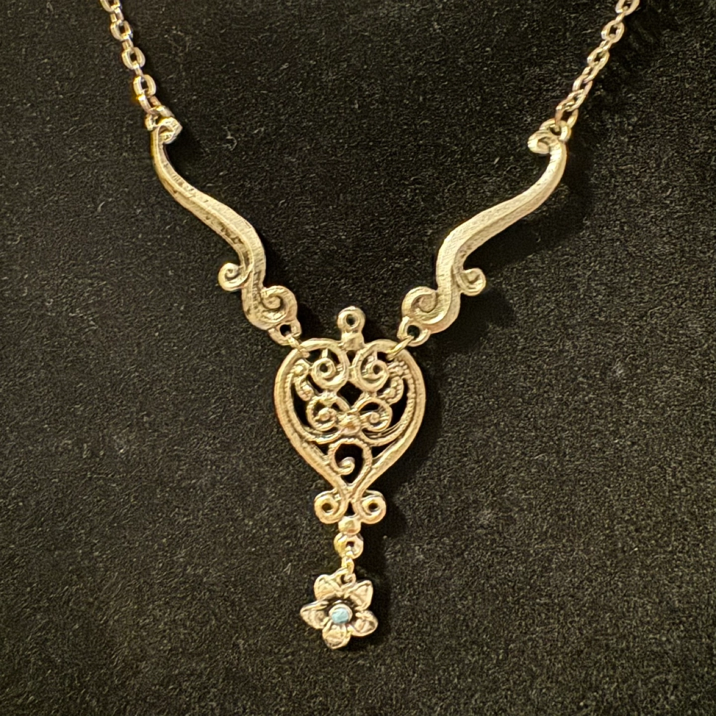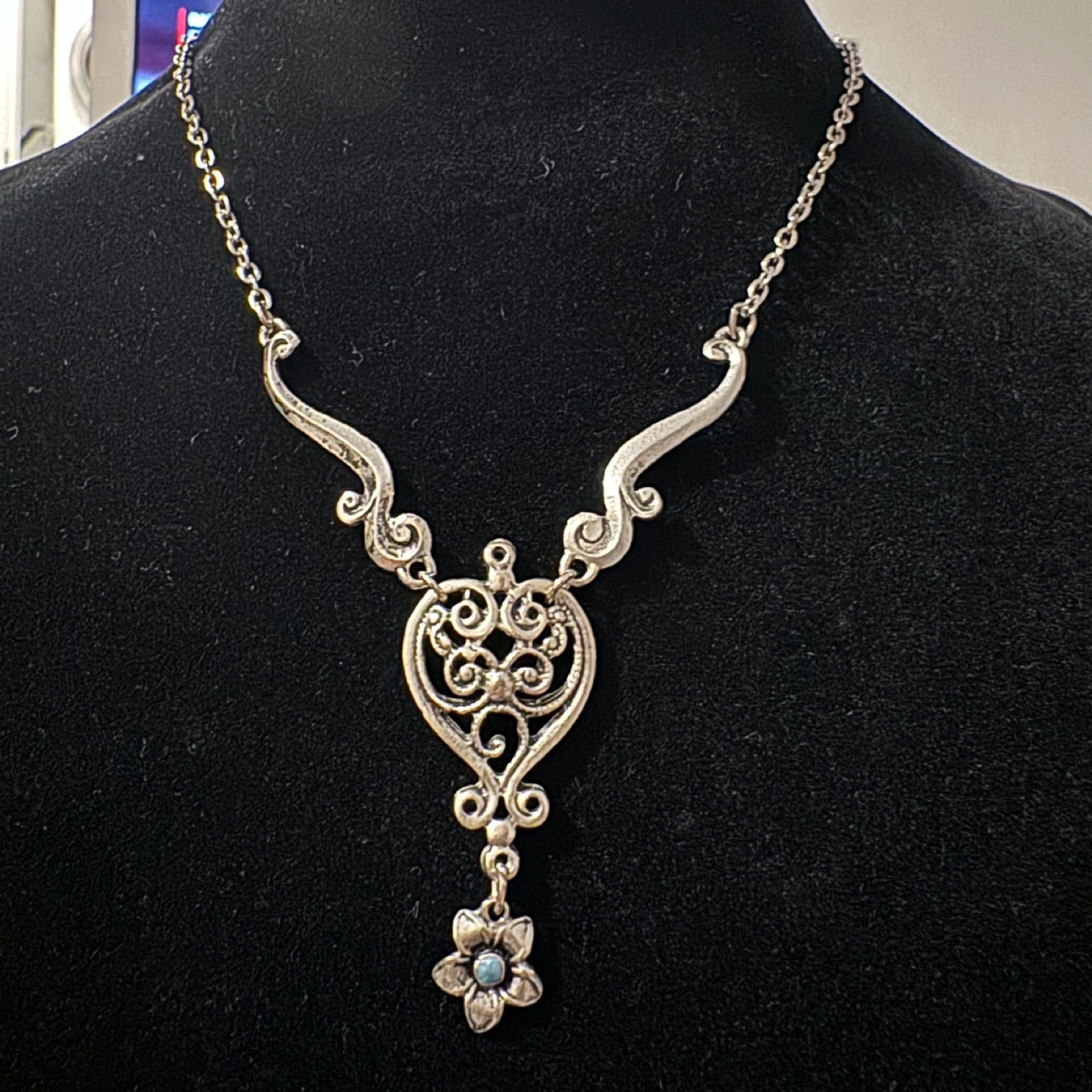 Intricate filigree design. Features a heart-shaped pendant and a dangling flower with a light blue stone. Silver tone metal. Chain included. Pick up at home address: Kennedy and St. Clair Ave. E. (Toronto) or Work Address (Weekdays, 9am-6pm): 333 Bay St. (Downtown Toronto)