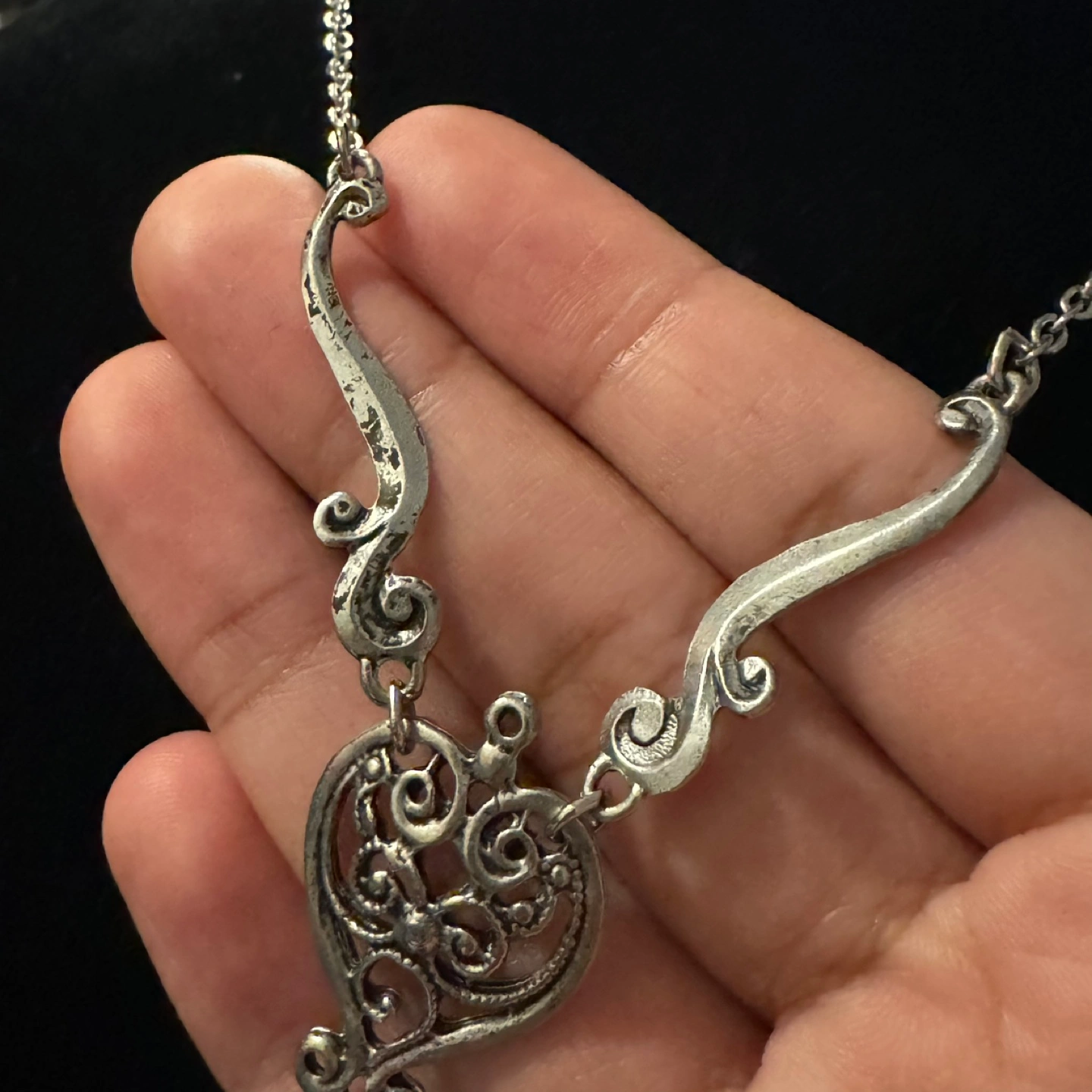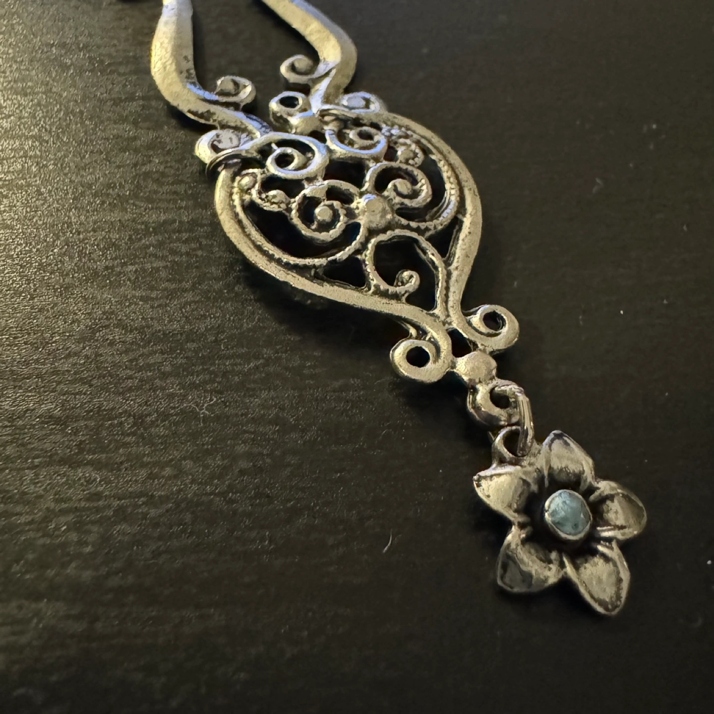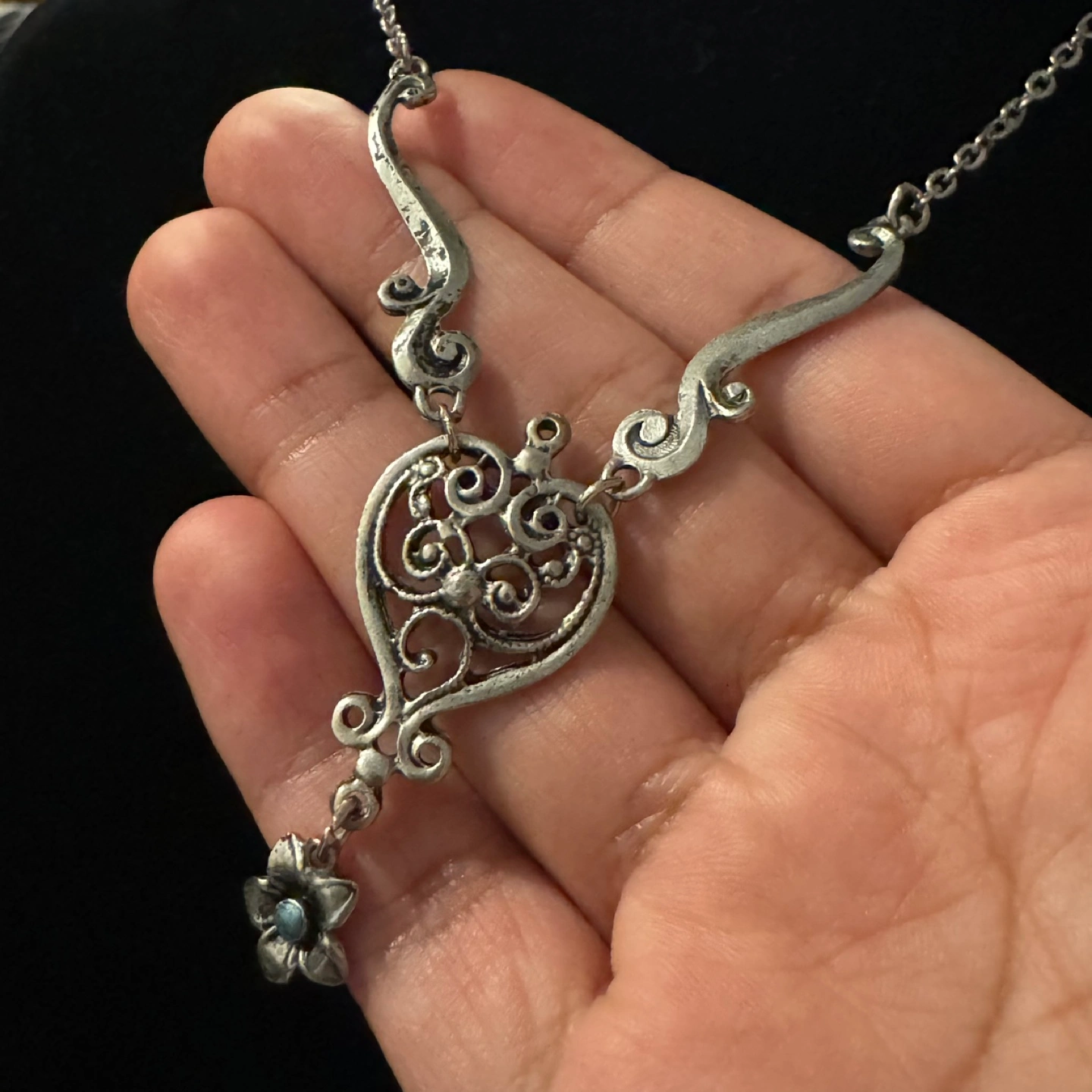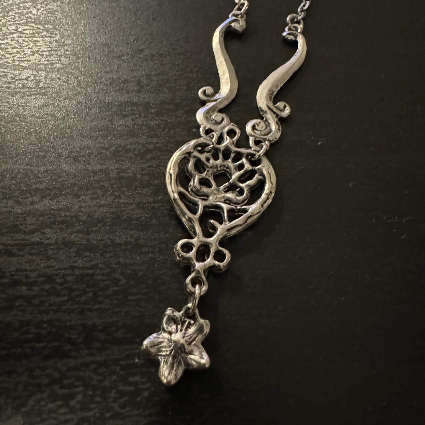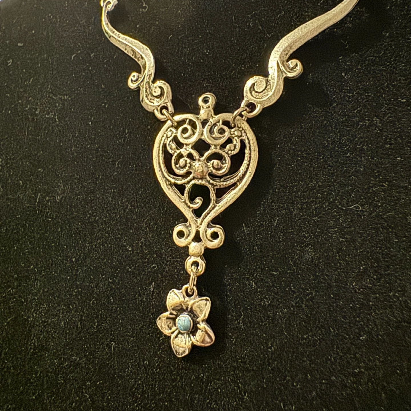 Intricate filigree design. Features a heart-shaped pendant and a dangling flower with a light blue stone. Silver tone metal. Chain included. Pick up at home address: Kennedy and St. Clair Ave. E. (Toronto) or Work Address (Weekdays, 9am-6pm): 333 Bay St. (Downtown Toronto)