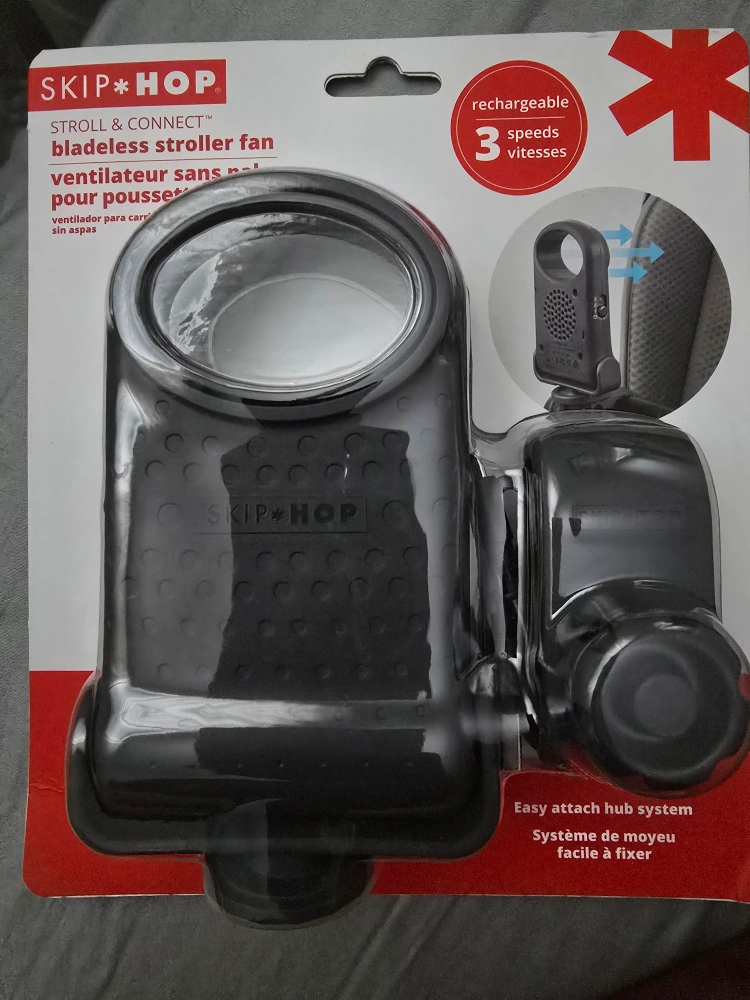 Rechargeable bladeless stroller fan. Three speeds. Easy attach hub system. Great for keeping baby cool. Currently $ 39.99 @ Babies R Us/ Toys R Us