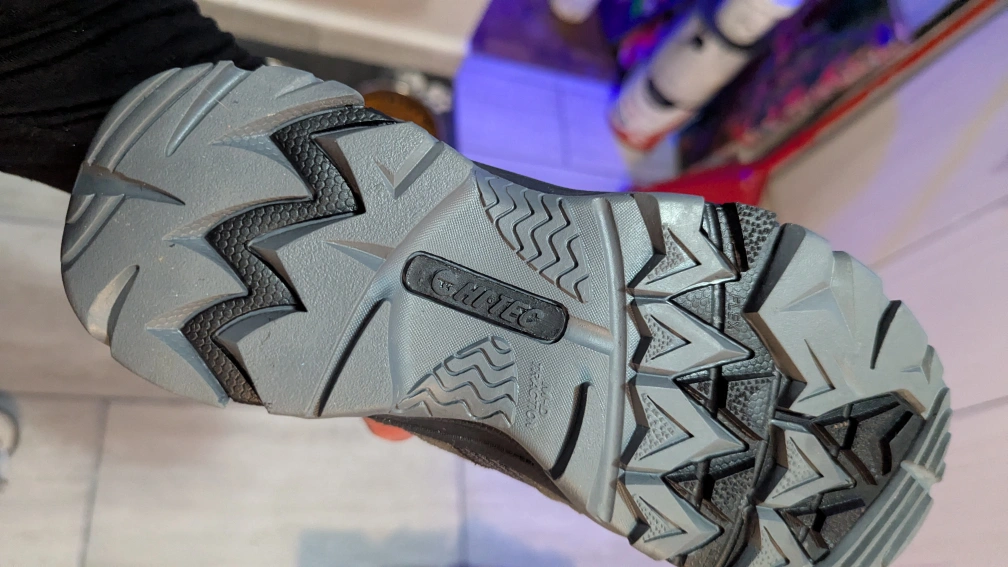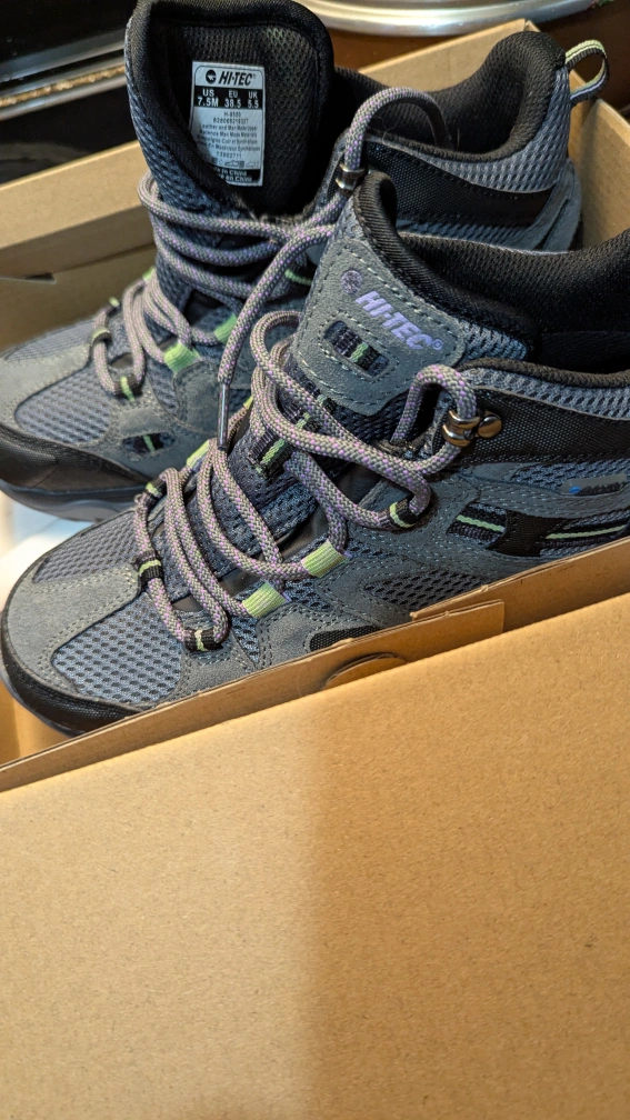 Women's waterproof hiking boots. Grey, charcoal, and lavender colours. Size US 7.5, EU 38.5, UK 5.5. Lightweight, durable, breathable, quality leather. Great grip.