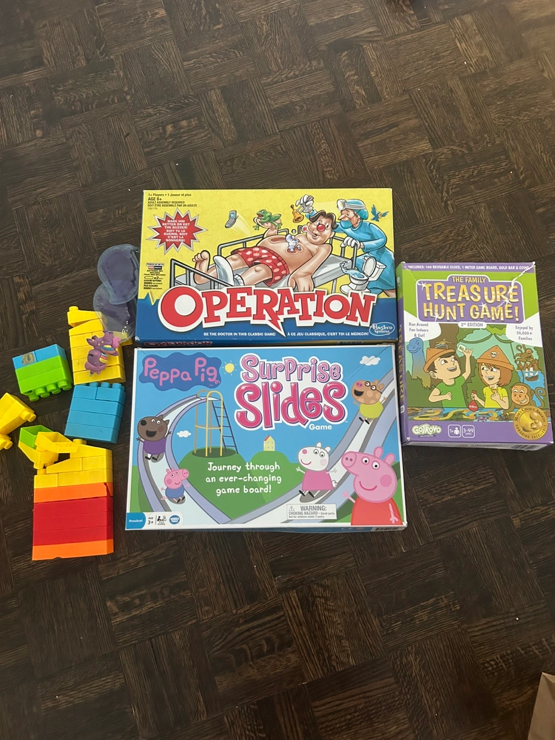 Bundle includes three board games: Operation, Peppa Pig Surprise Slides, and The Family Treasure Hunt Game. Also includes a set of colourful building blocks.