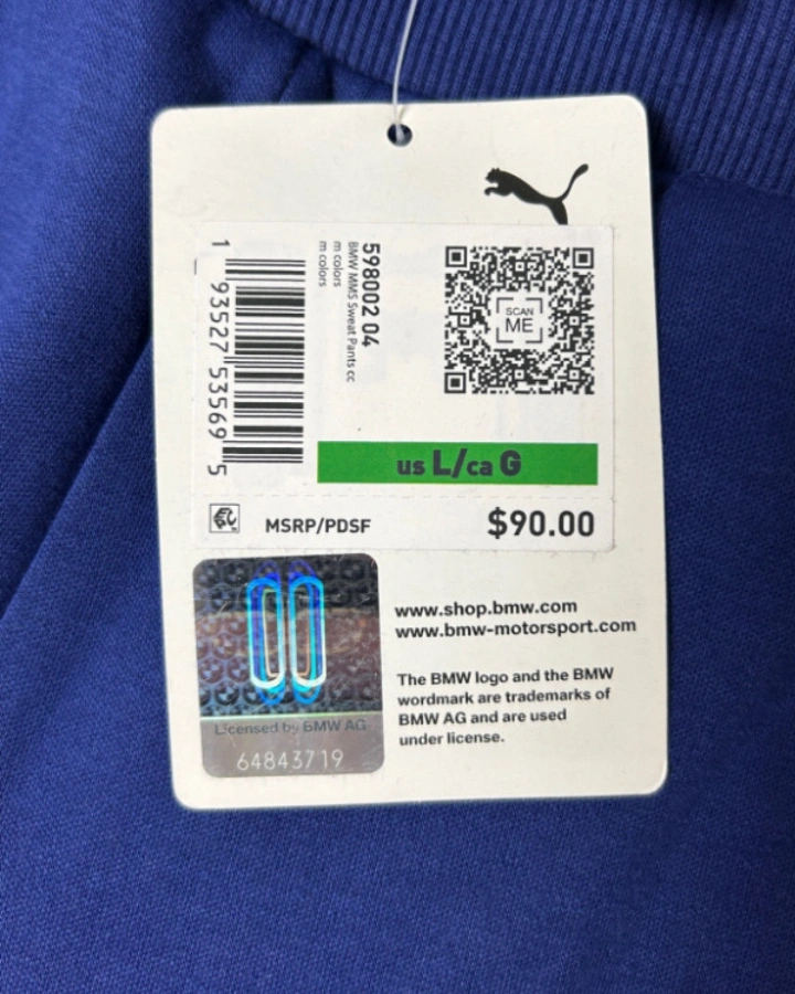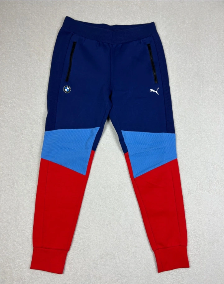 Men's BMW Motorsport Puma sweatpants. Navy blue, red, and light blue colourblocked design. Features zippered pockets. Size large.