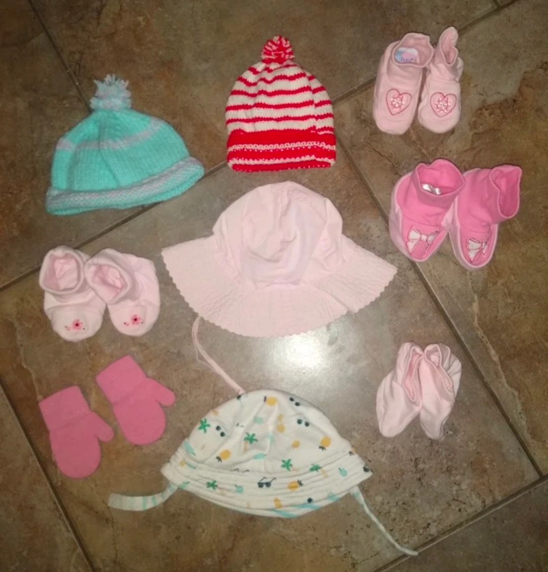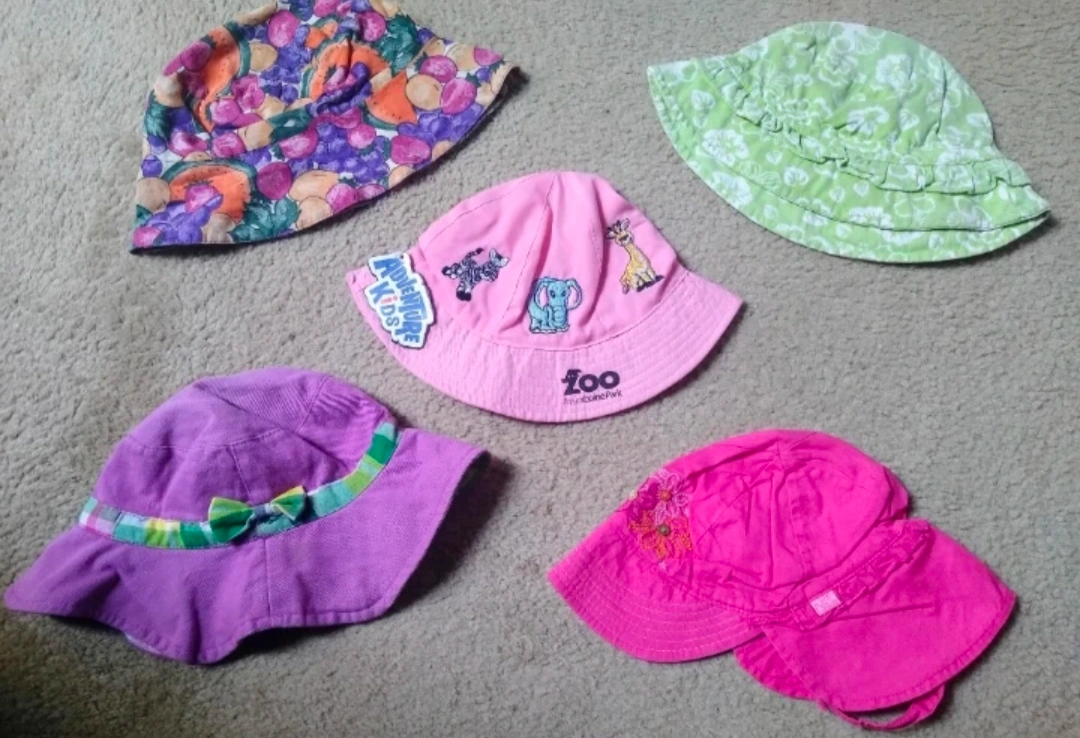 Various children's summer and winter hats. All in excellent condition and one brand new with tags still attached. There are also baby touques, booties and mittens. Ages: 6 months - 7 years $3 each