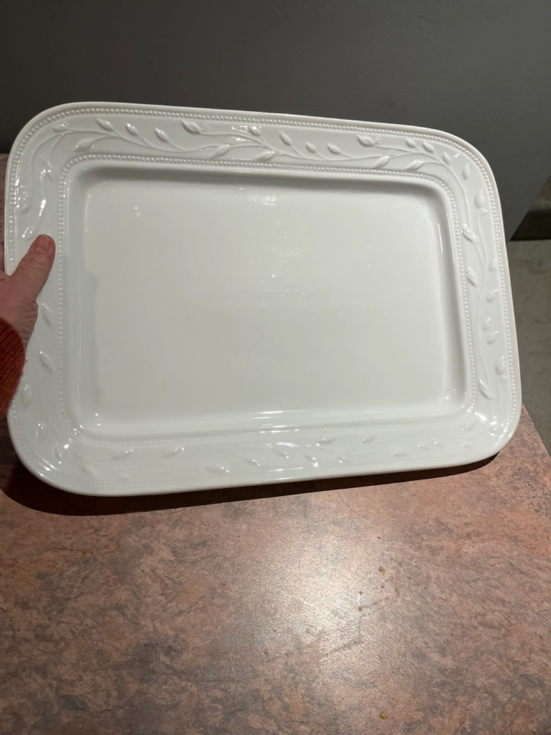Elegant rectangular serving platter. White ceramic with embossed leaf design. Perfect for entertaining. Cash only