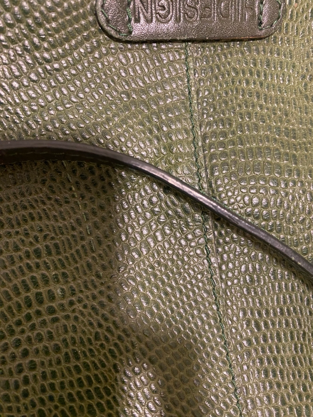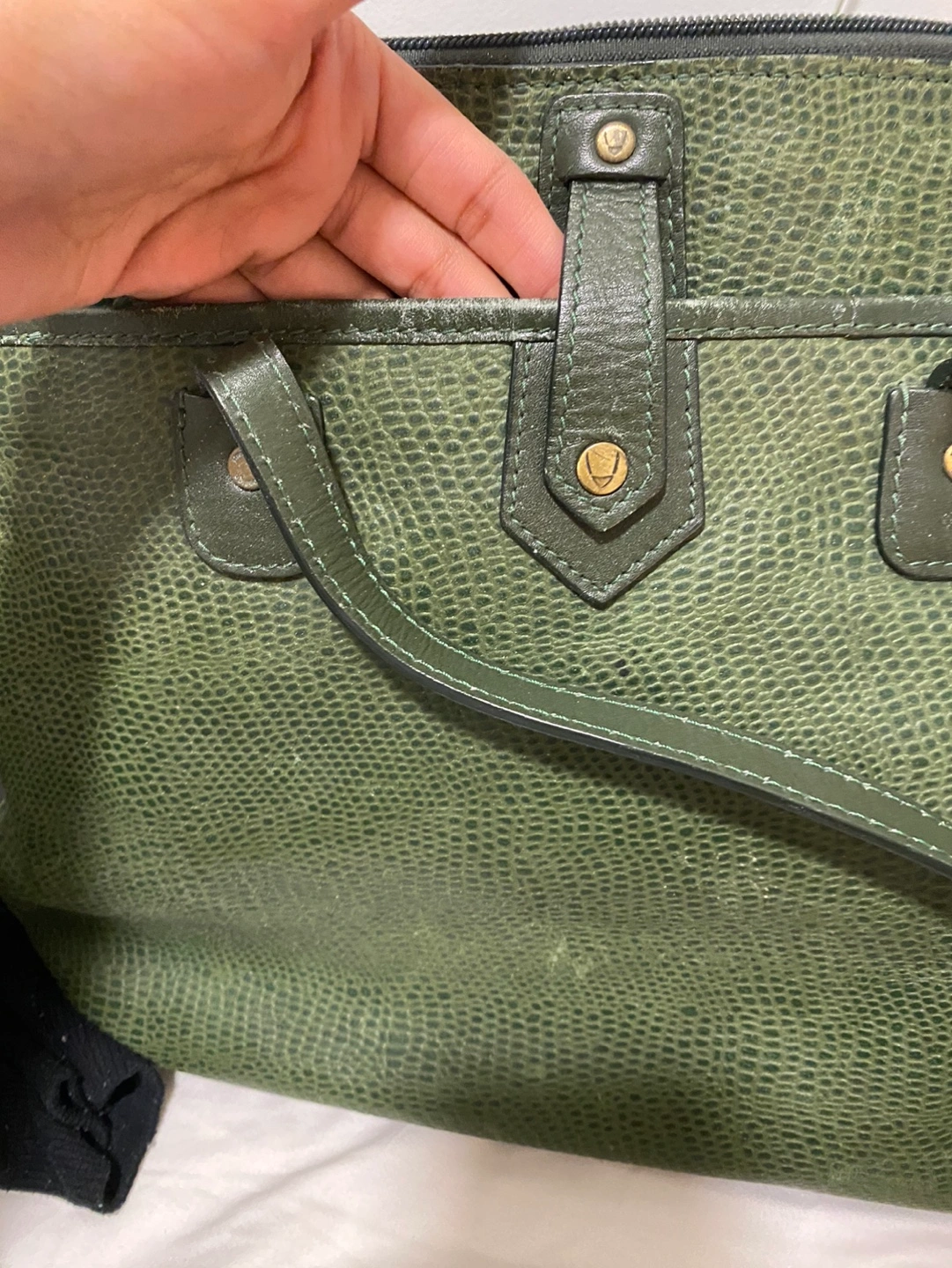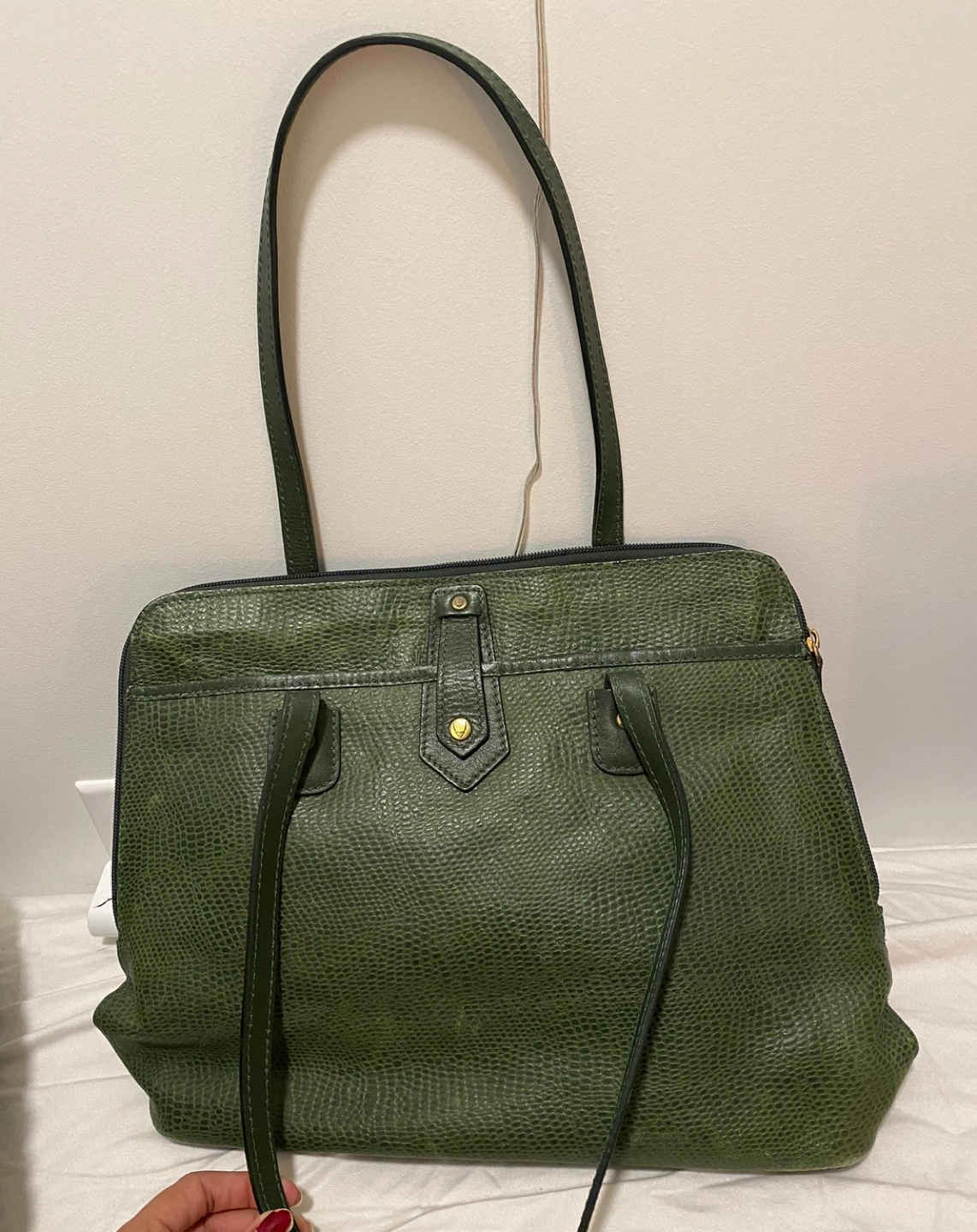 Dark green leather tote bag. Features two top handles and a zip closure. Gold-toned hardware accents. Snakeskin-embossed leather. Please check my other listings for bundle discount
