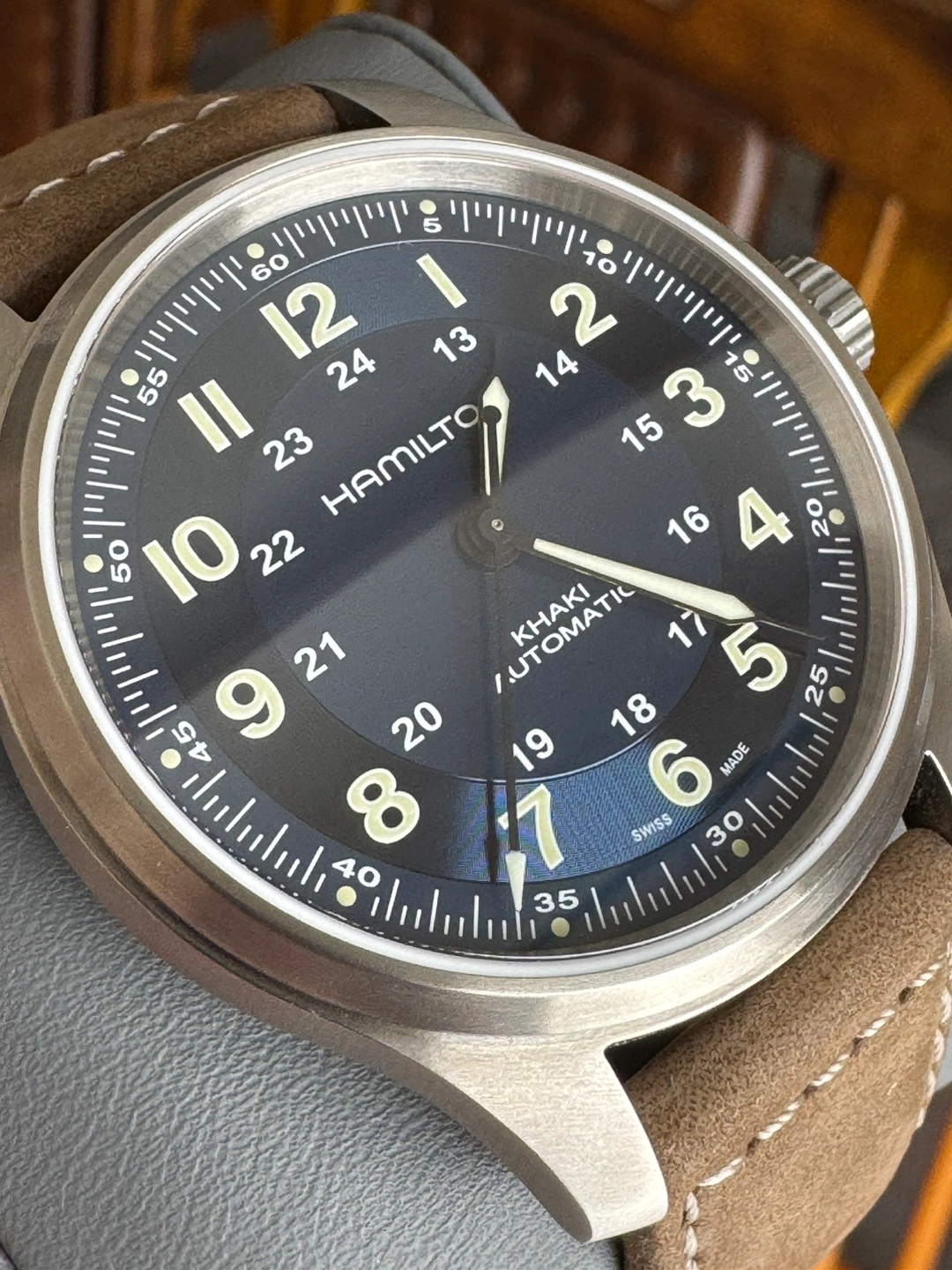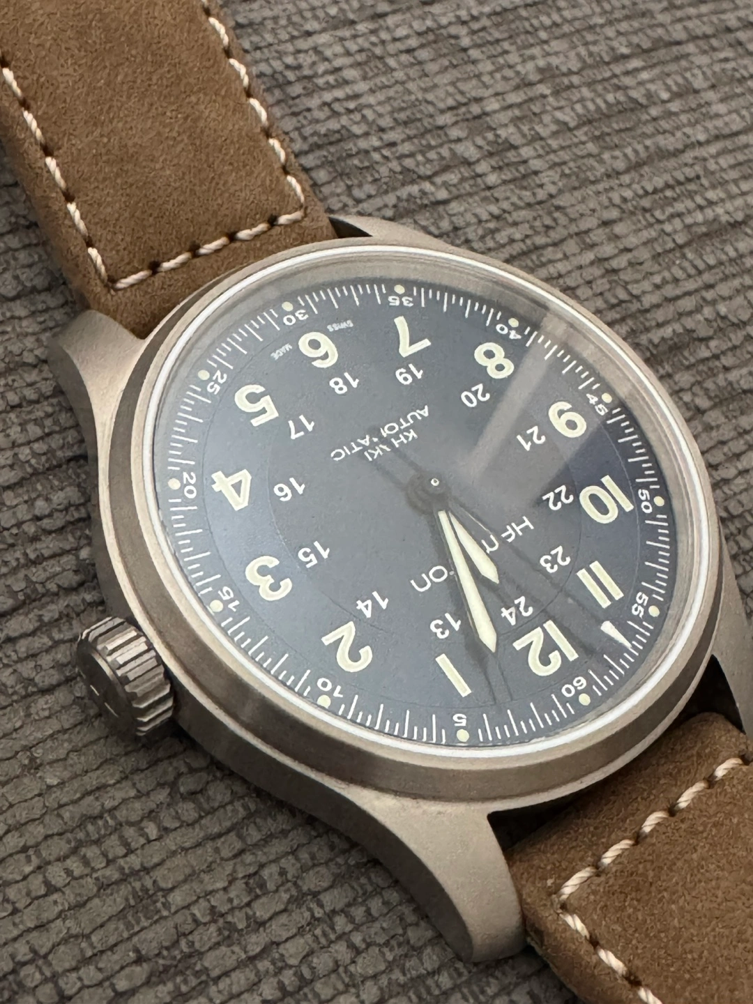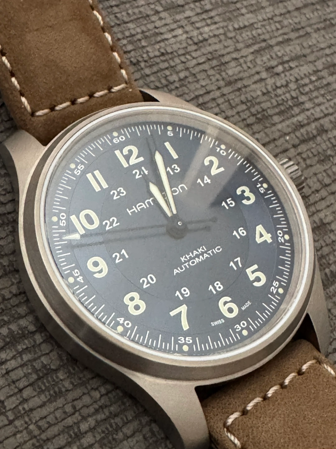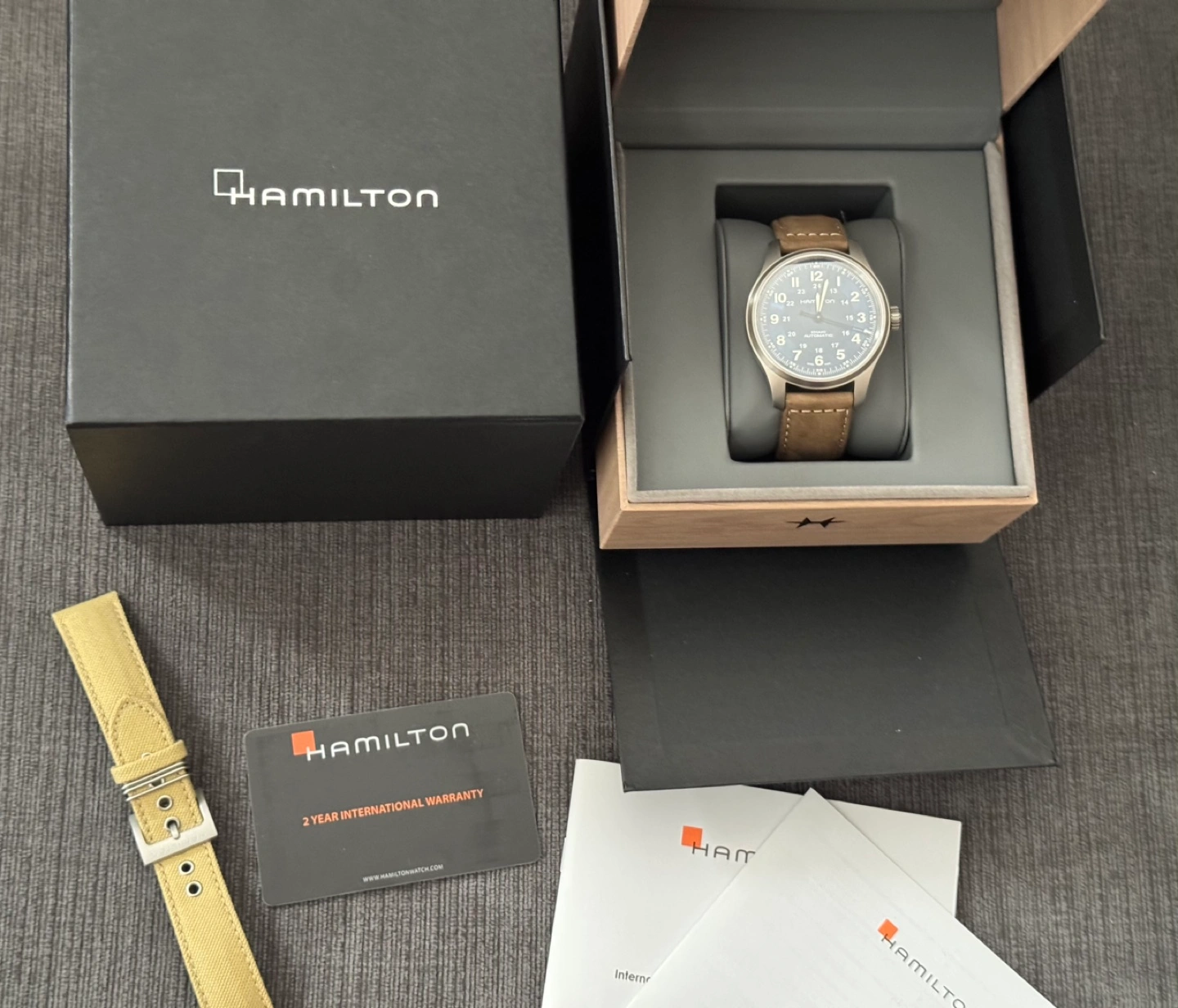 PLEASE READ DESCRIPTION FOR DETAILS AND SIZING BEFORE BUYING - Like New condition, fully functional - Titanium - 42mm across case size - Full set box, papers, filled out card - Additional Hamilton beige textile strap included, $130 value - Automatic - ref. H70545540 - $1440+tax MSRP Pickup in Markham or downtown Toronto. No holds without deposit, first come first served. If you like this watch, check out my other listings for similar watches! Buy multiple for a small discount