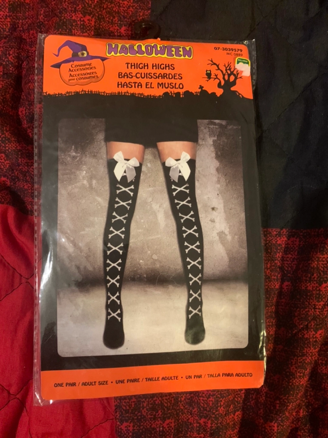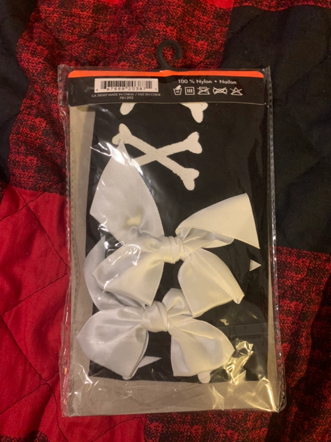 Black thigh highs with white crossbones and bows. Adult size. 100% nylon. New with tags. porch pickup near erin mills town center