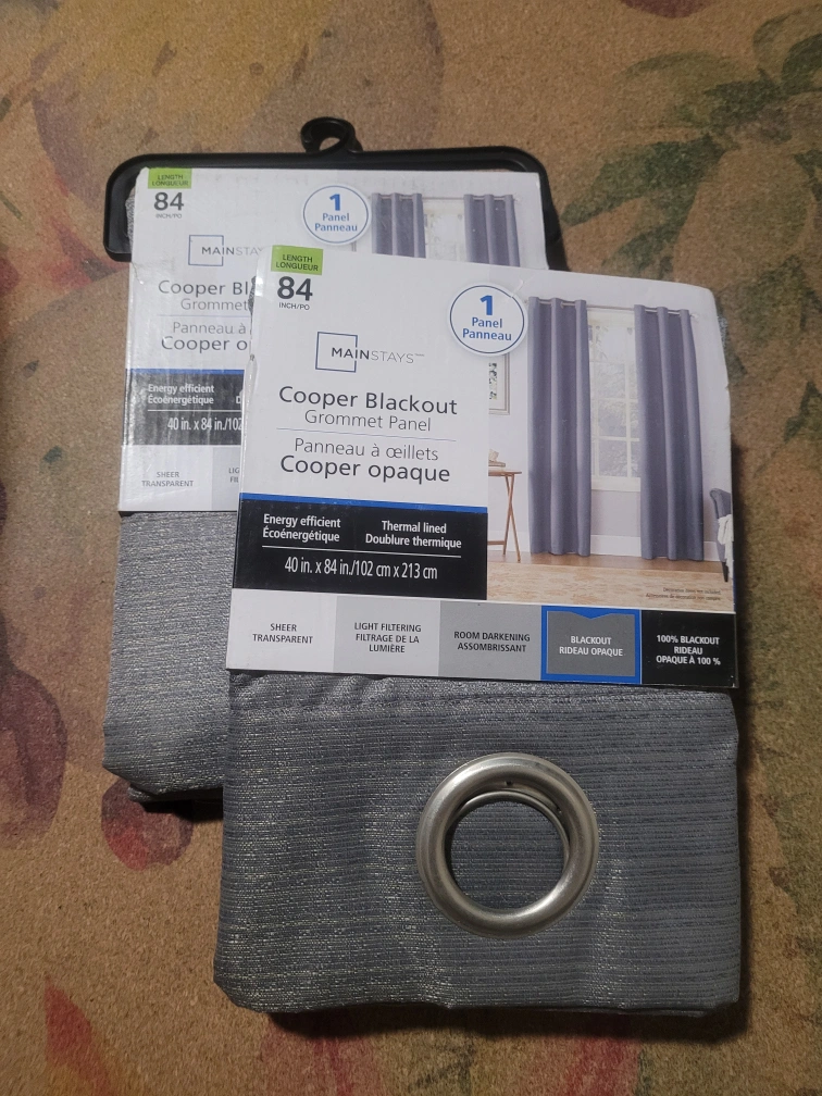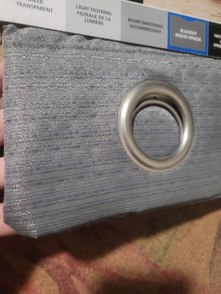 Two shimmery grey/silver blackout grommet curtain panels. Energy efficient and thermal lined. Light filtering, room darkening, 100% blackout. Silver grommets. 40 inches wide by 84 inches long. pick up in Westwood or delivery for an extra fee