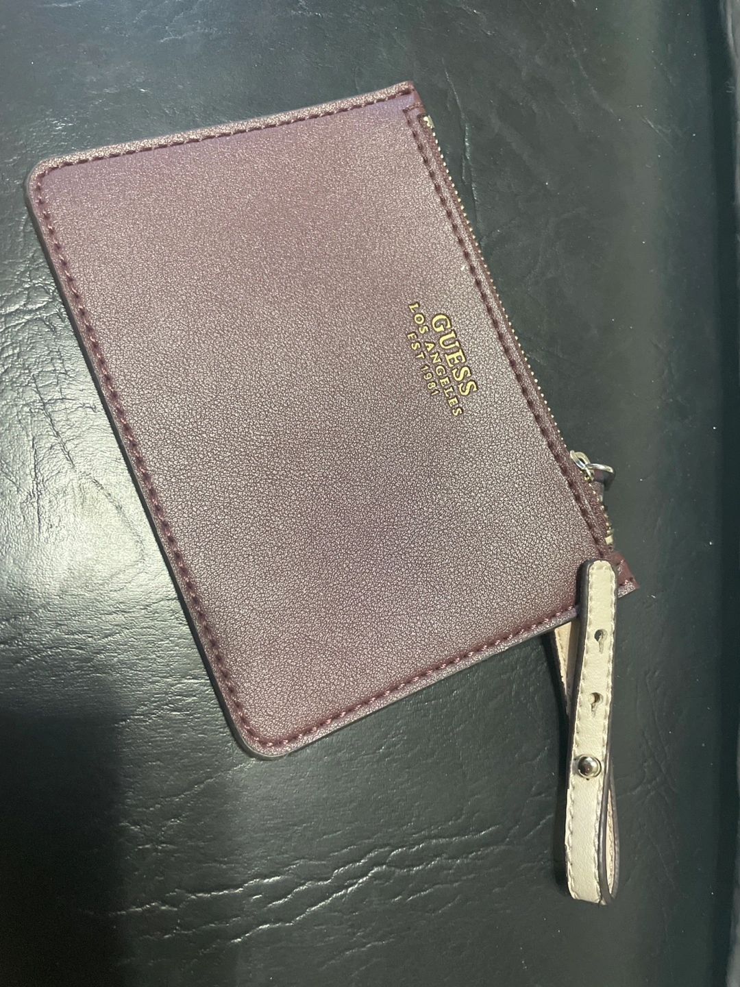 Small maroon zipper pouch. Features a small off-white zipper pull. Compact and convenient for everyday use.