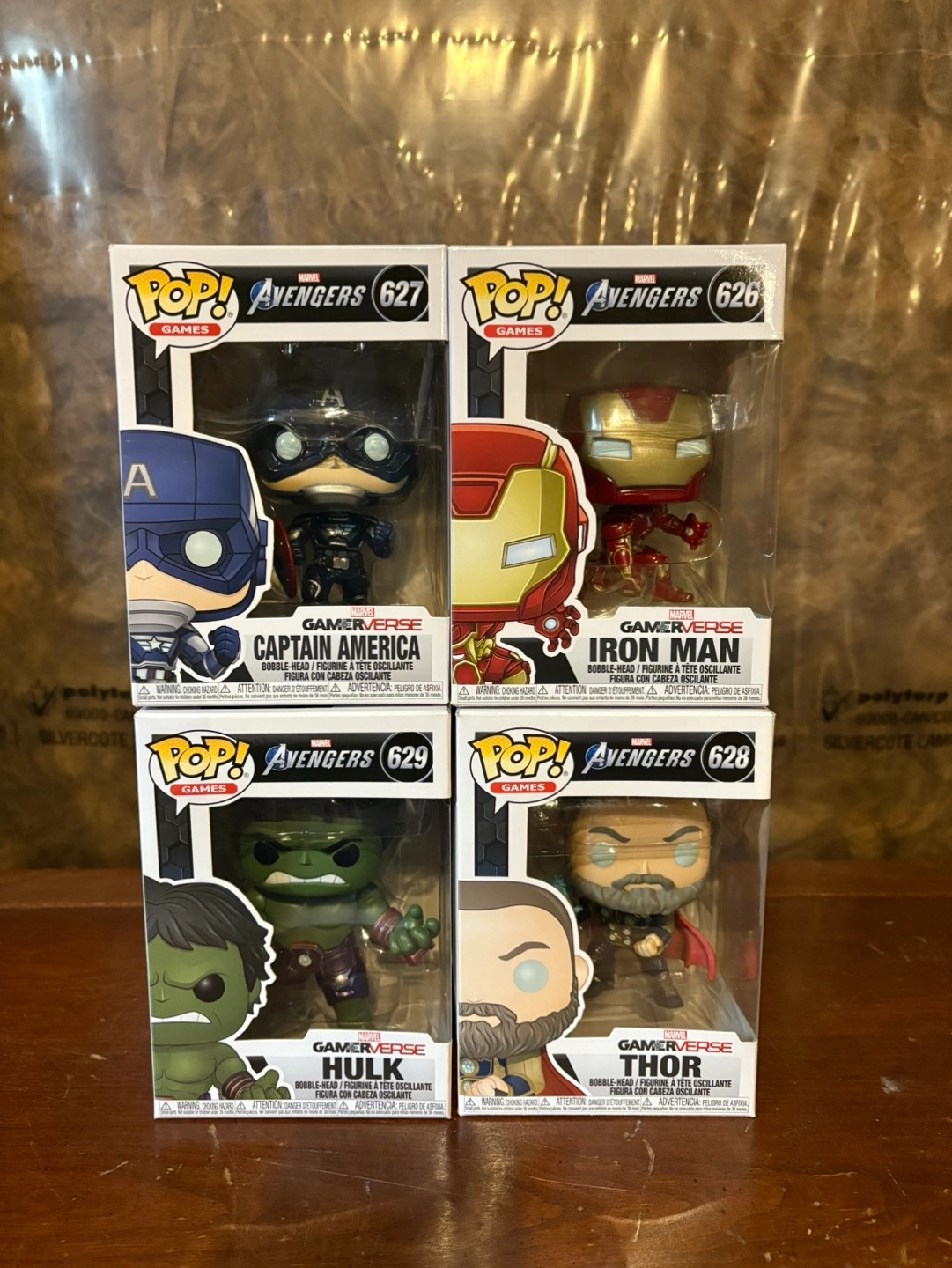 Four new Gamerverse Marvel Avengers Pop! Vinyl figures. Includes Captain America, Iron Man, Hulk, and Thor. Bobble-head figures in original packaging. $50 for all 4