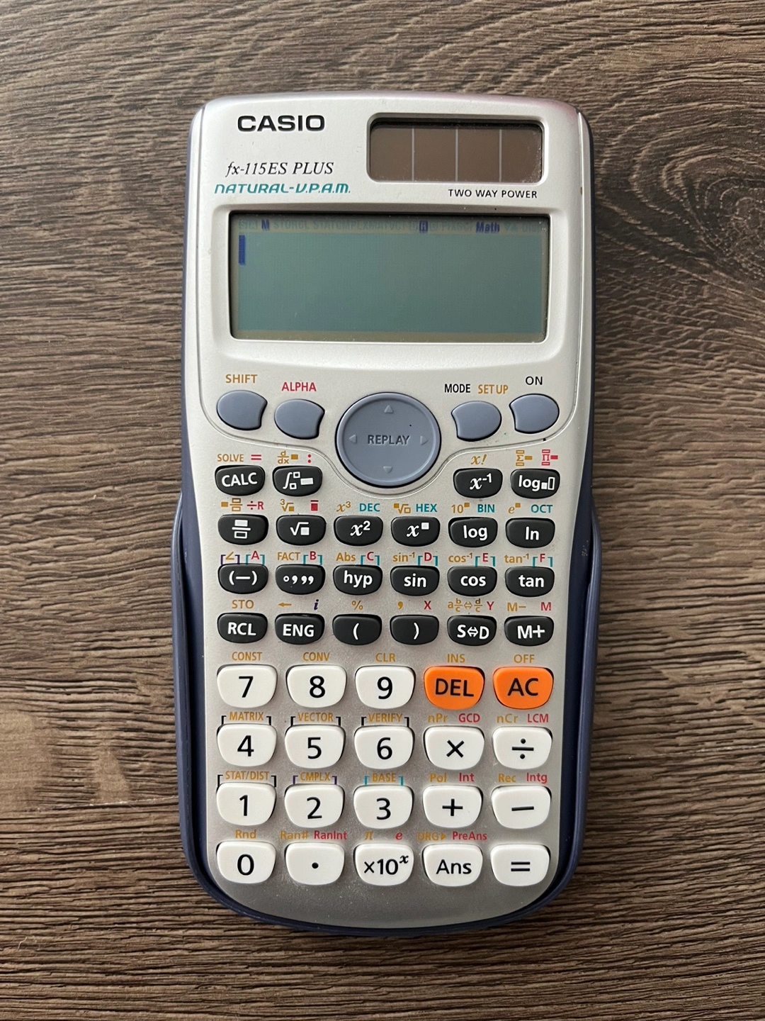 Used CASIO fx-115ES PLUS scientific calculator. Two-way power. Includes hard case. Many functions.