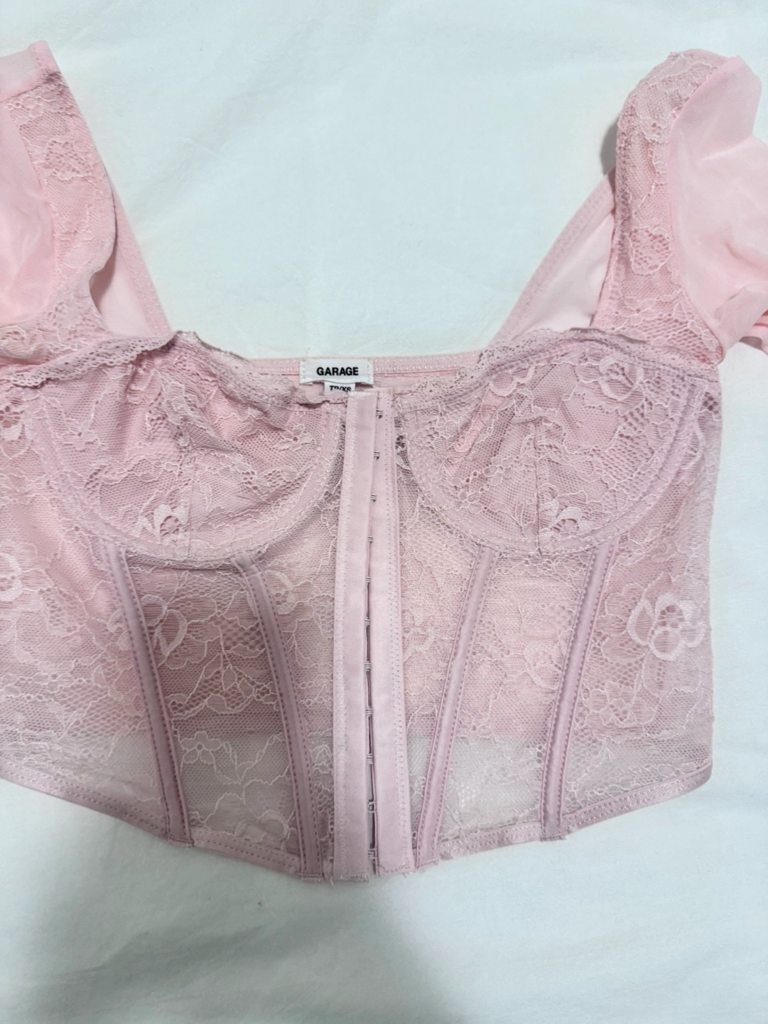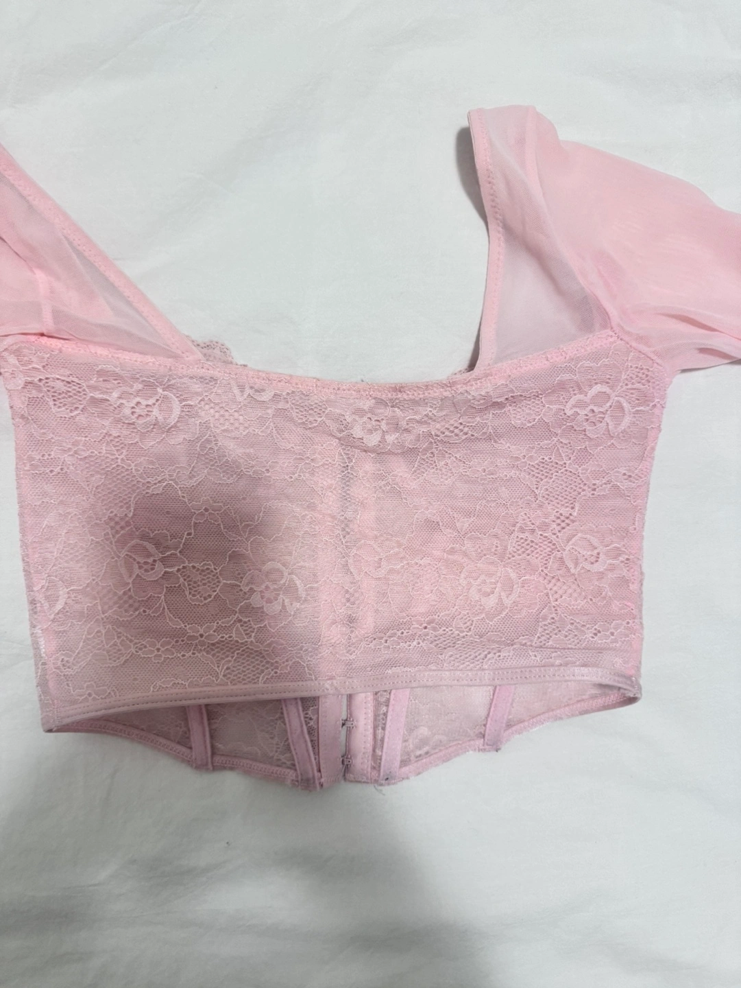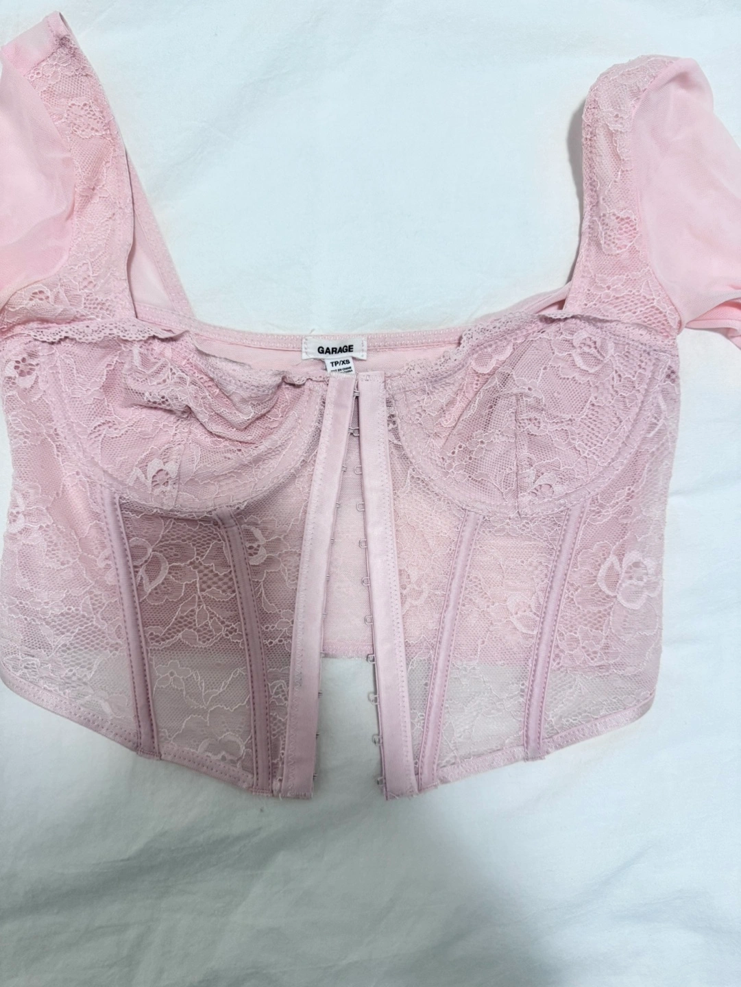 Beautiful pink lace corset top. Features short sleeves and a front hook closure. Perfect for a night out or special occasion.