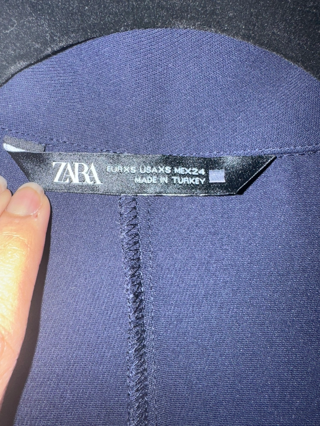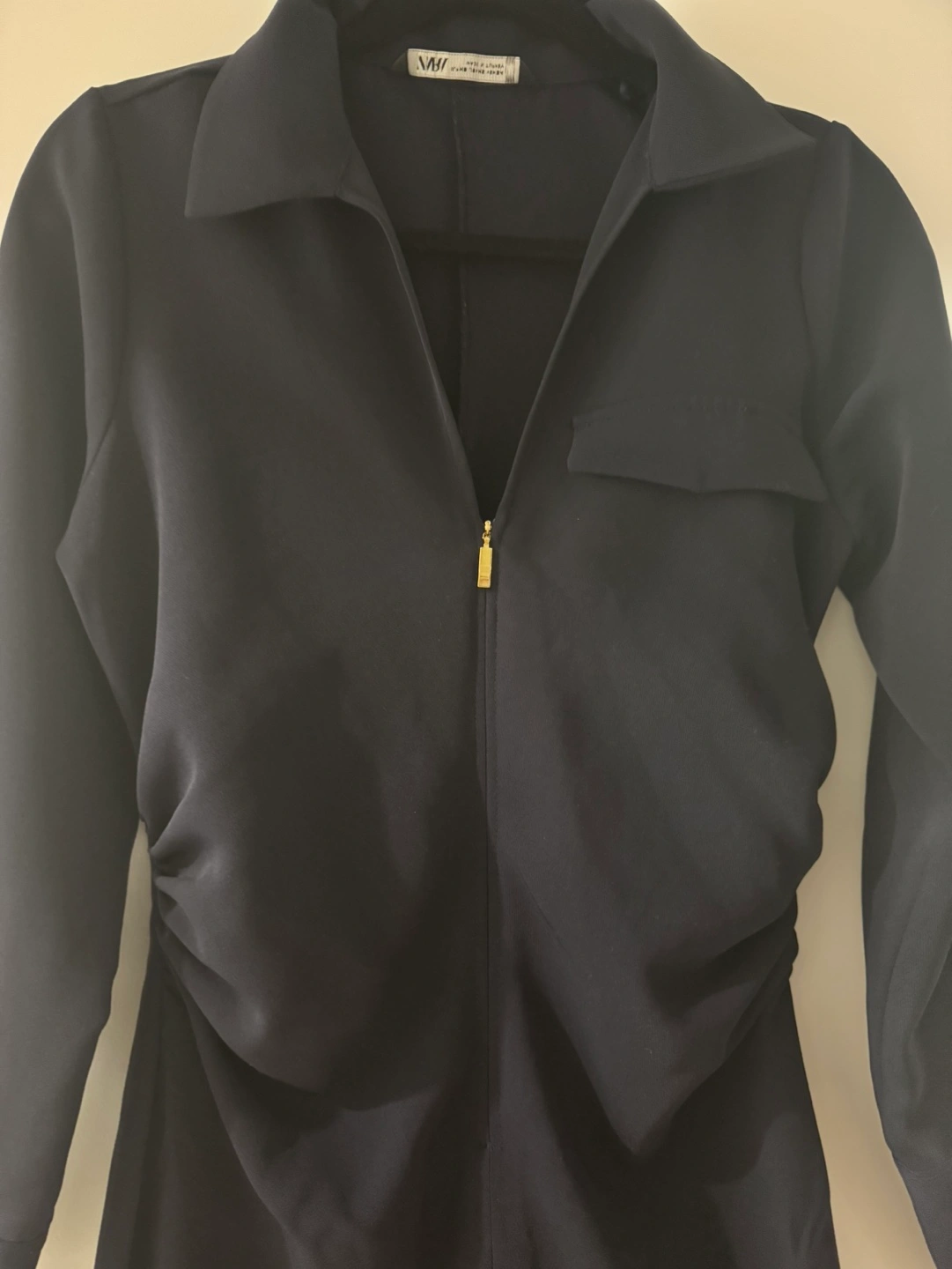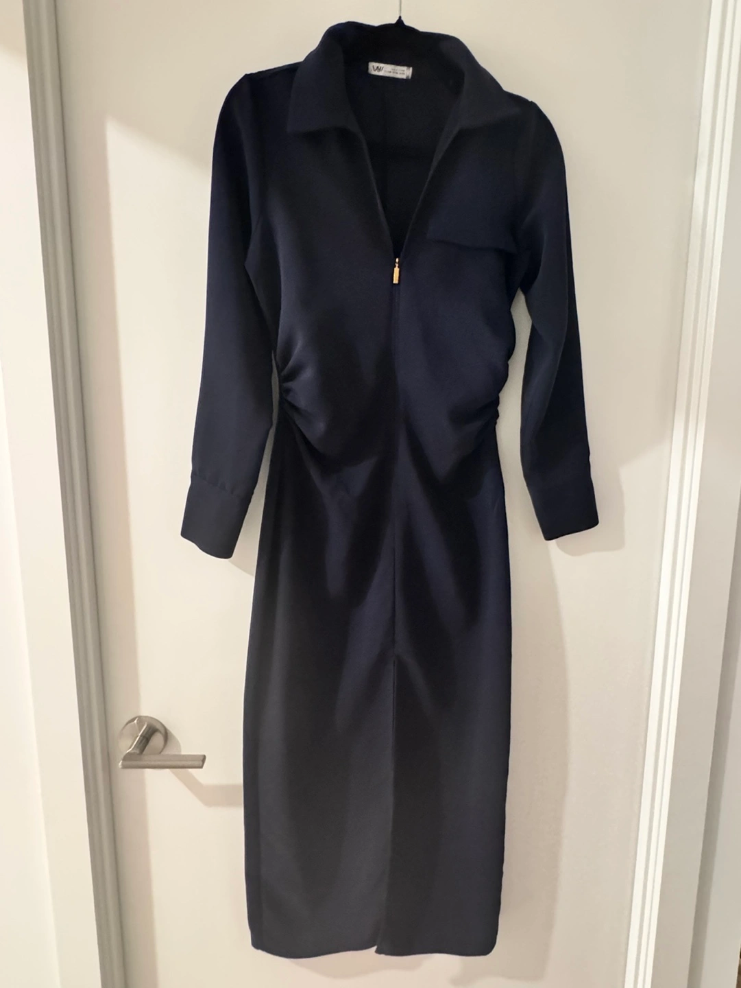 Stunning navy blue midi dress. Features a collared neckline, long sleeves, and a front zip closure. Cinched waist detail. Excellent for work or a night out.