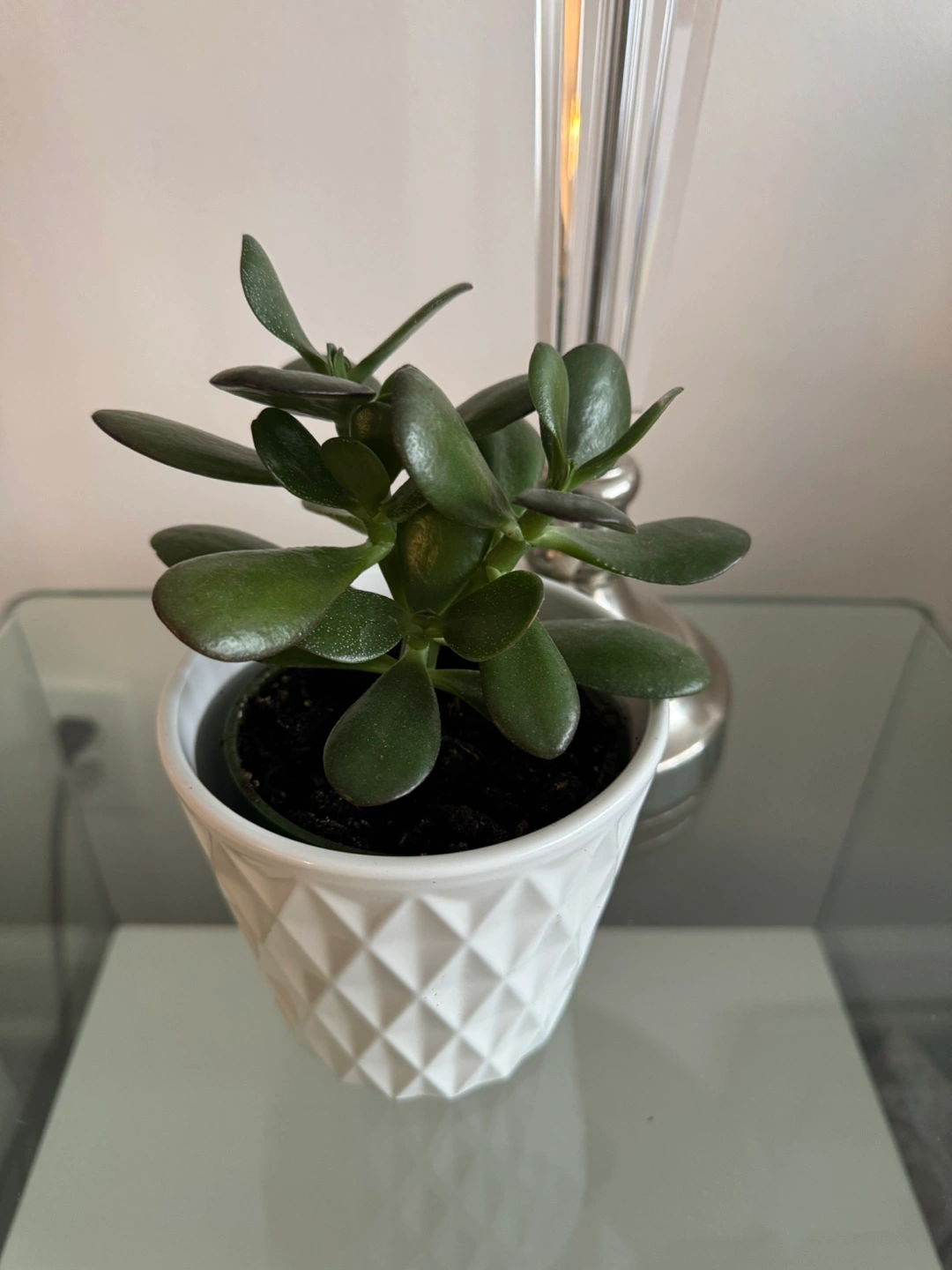 Very healthy jade plant in a small white diamond-patterned pot. Perfect for a desk or shelf or table. It’s also ideal as a gift . Easy to care for. Only 1 left . Pick up at Steeles/ Bathurst.