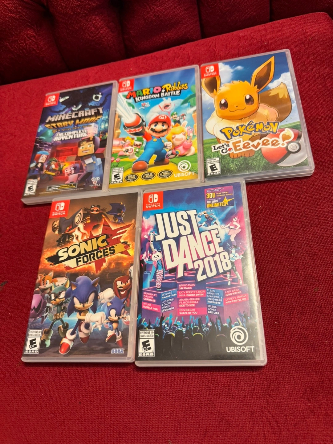 Five pre-owned Nintendo Switch games. Includes: Sonic Forces, Just Dance 2018, Minecraft Story Mode, Mario + Rabbids Kingdom Battle, and PokĆ©mon Letās Go Eevee. Great for gaming fun!