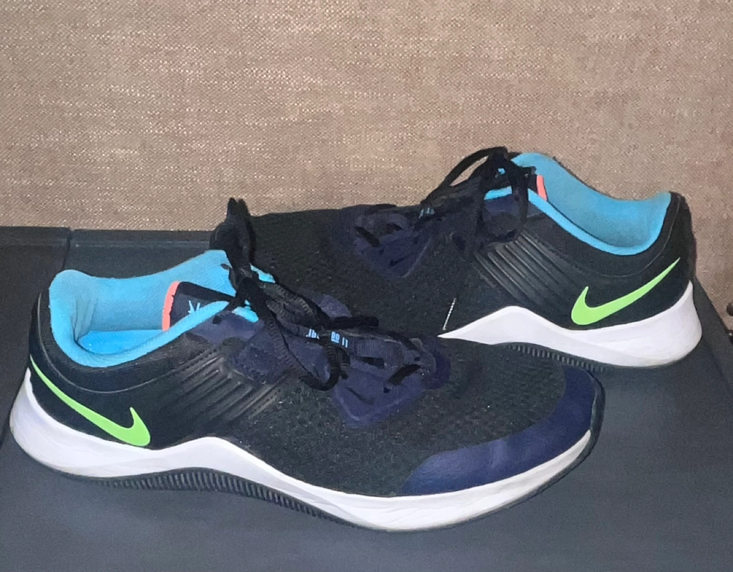 Nike running shoes. Size US 12. Black, navy, and light blue accents. Good condition. Lightweight and comfortable.