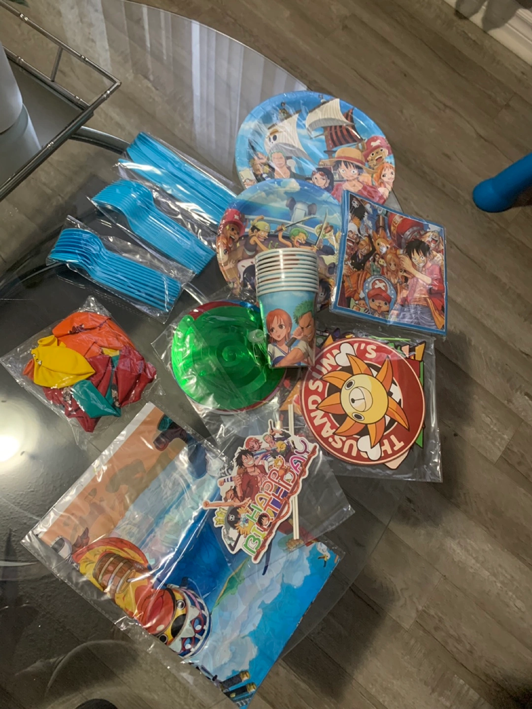 New anime set. Includes for 10, plates, napkins, cups, forks, spoons, balloons, a banner, and cake topper. Perfect for a One Piece birthday celebration.