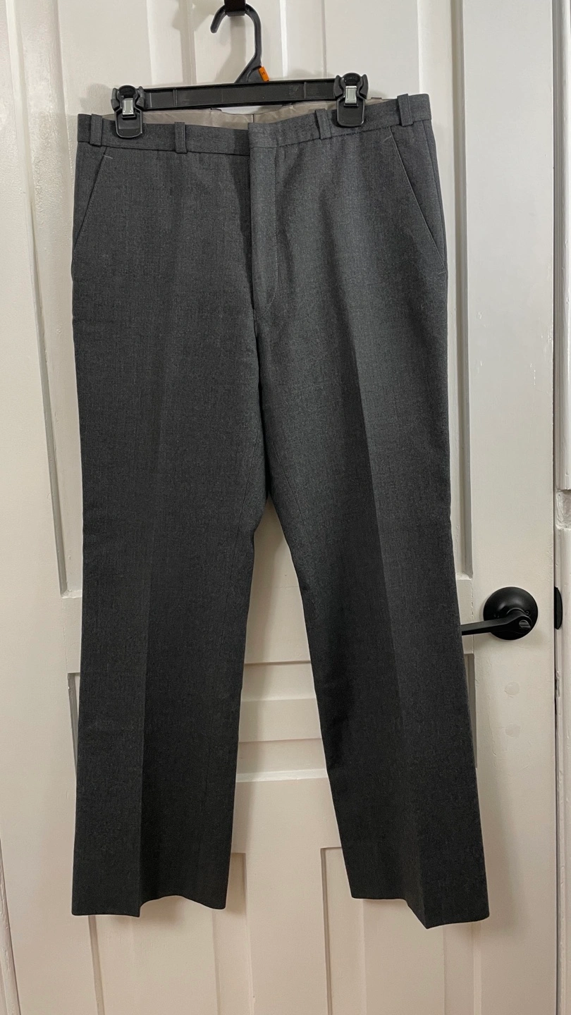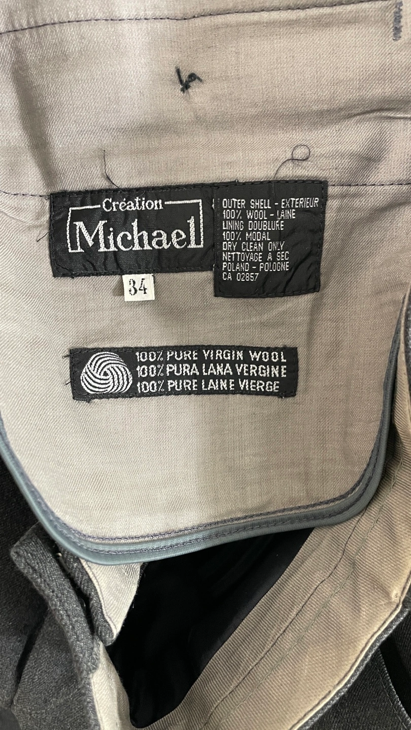 Grey pleated pants with a soft twill weave. Made in Poland, the pants are in good condition and without issue. Size 34 but fit smaller (32?) Measurements: 16" Waist 11.25" Rise 29" Inseam 9" Leg Opening Pickup only. Located near Roncesvalles and Dundas Street West.