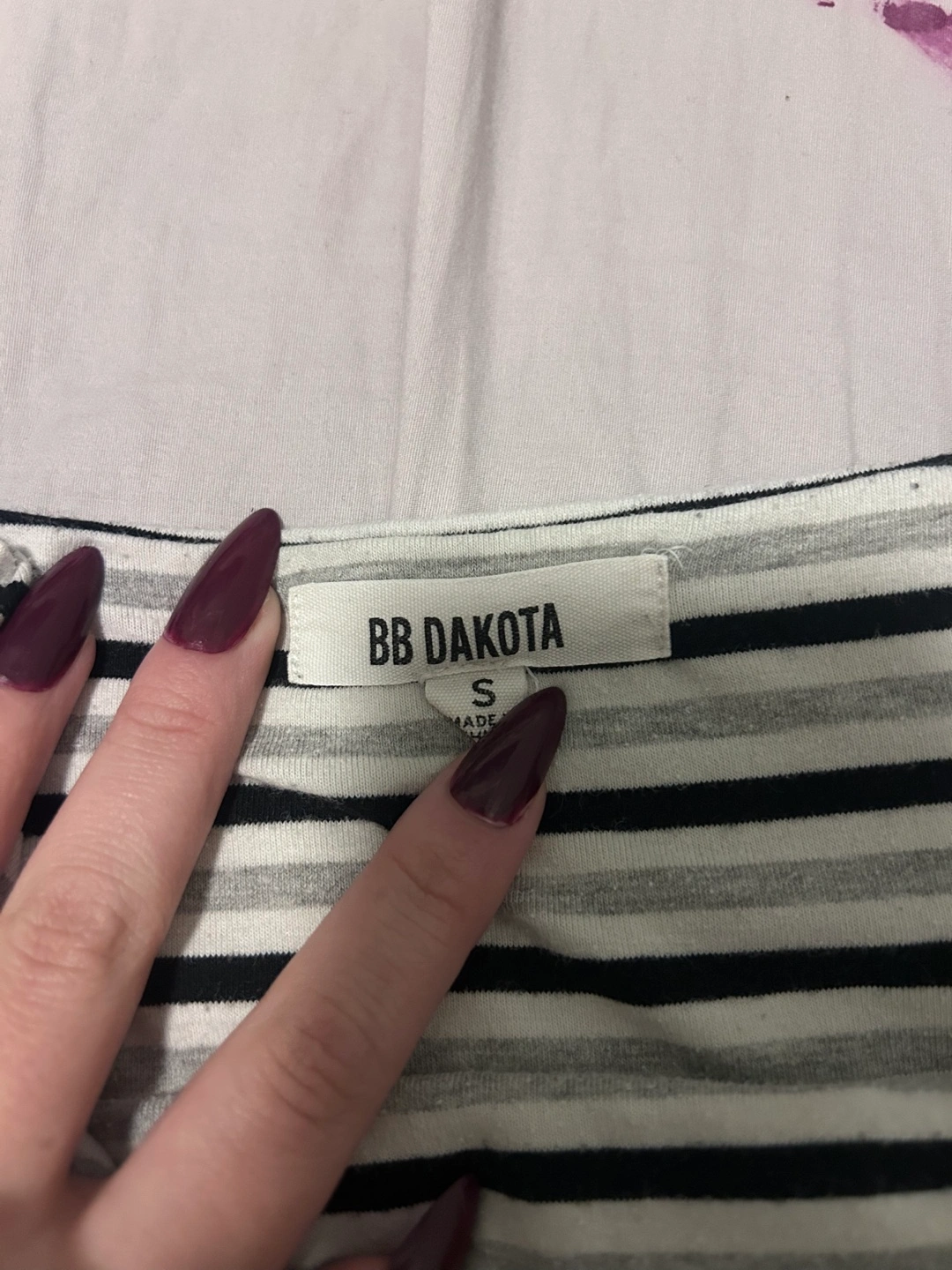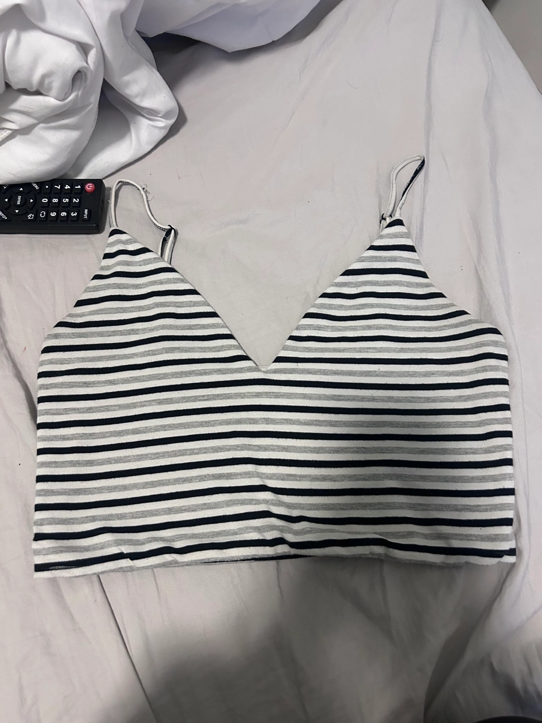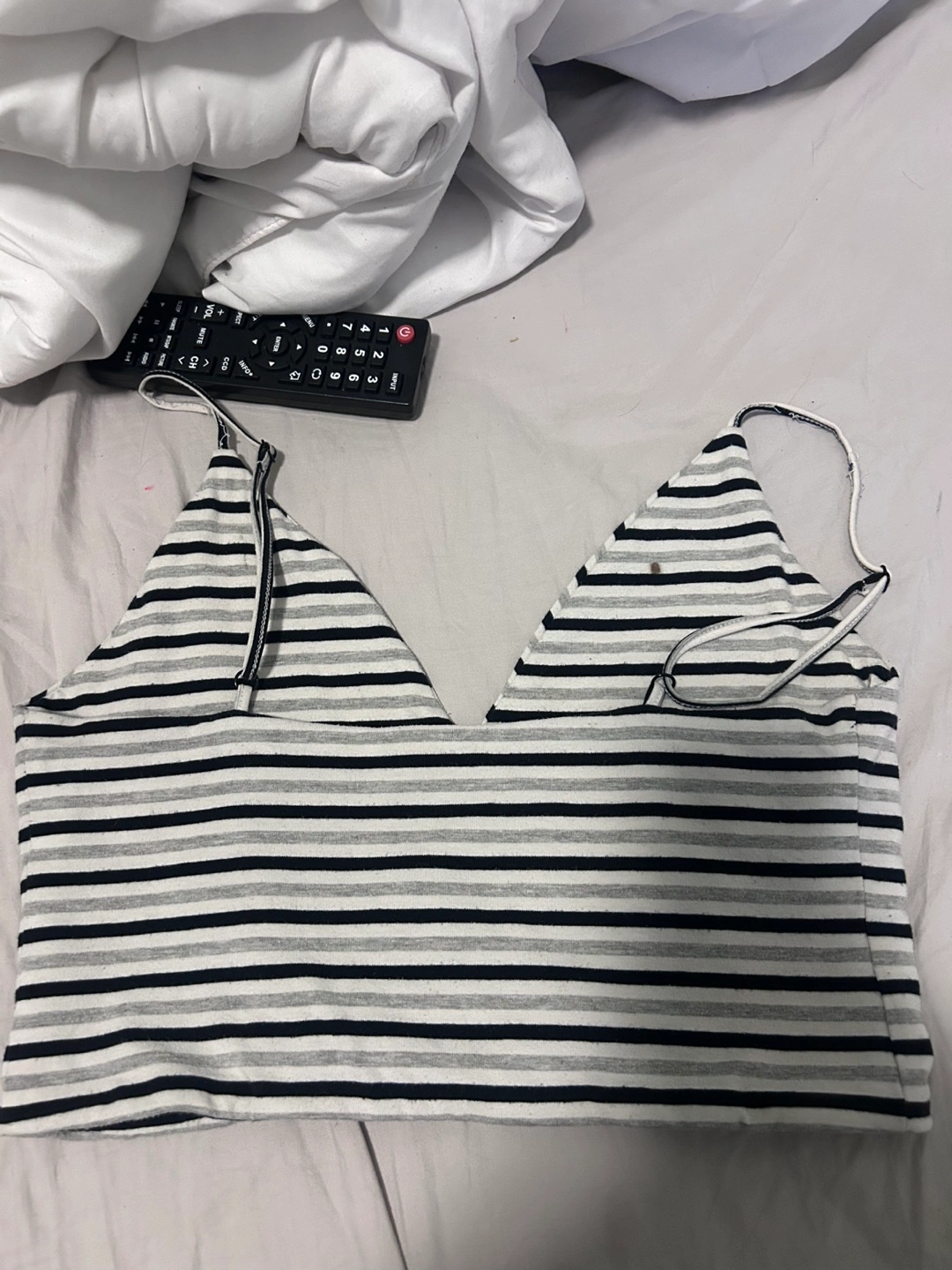 Black, white, and grey striped crop top. Spaghetti straps. V-neck. .