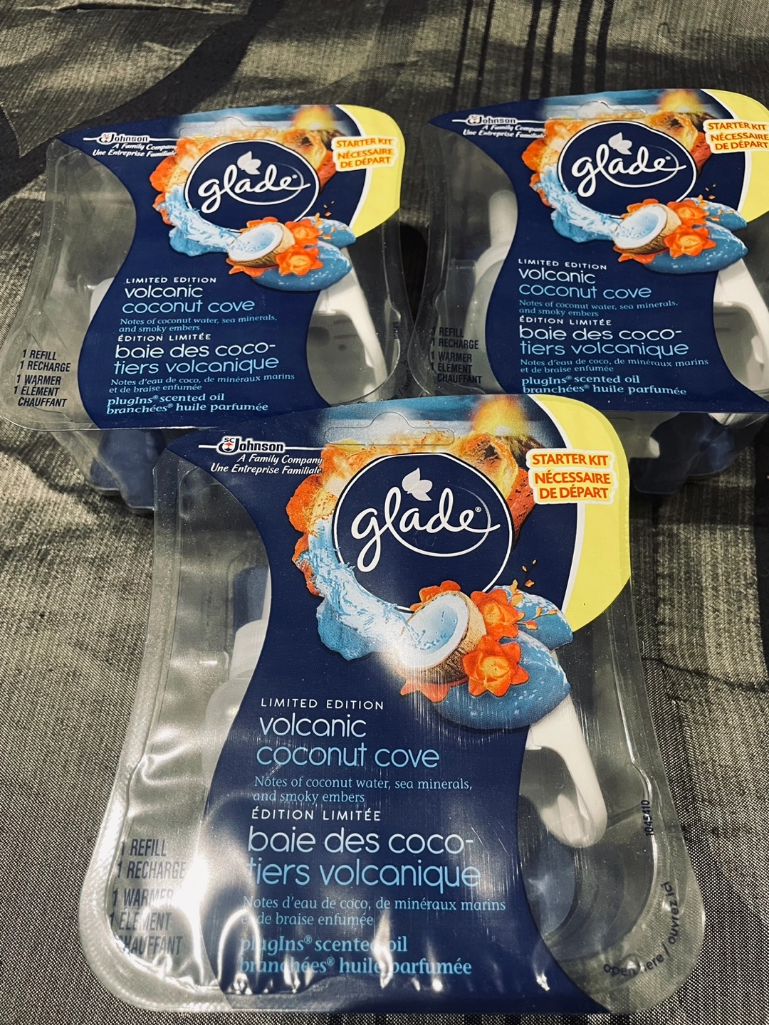 Three Glade plug-in air freshener starter kits. Limited edition Volcanic Cove coconut scent. Includes one warmer and one refill per kit. Notes of coconut water, sea minerals, and smoky embers. 3 packs for $10