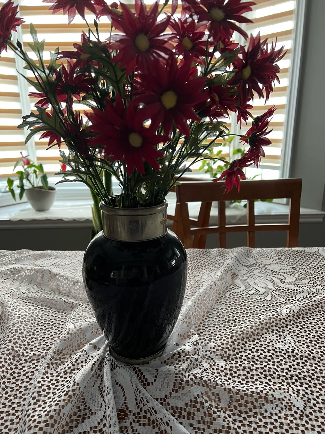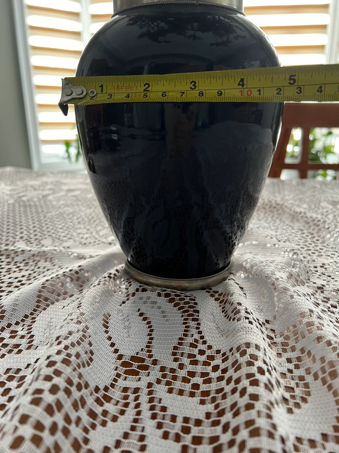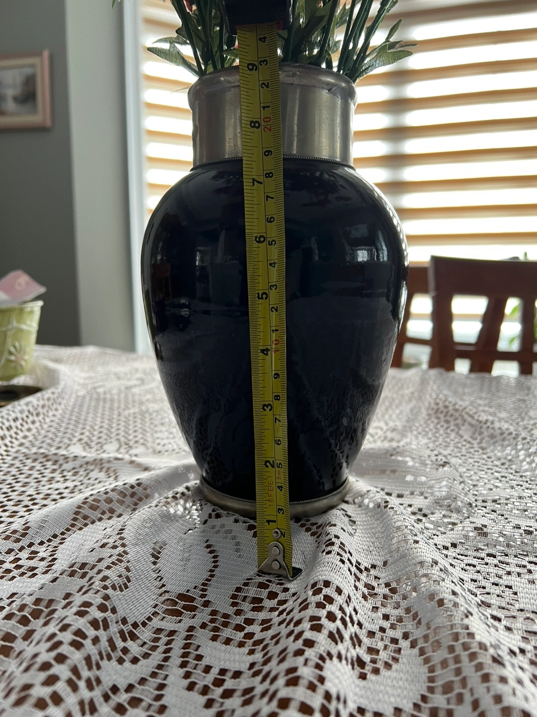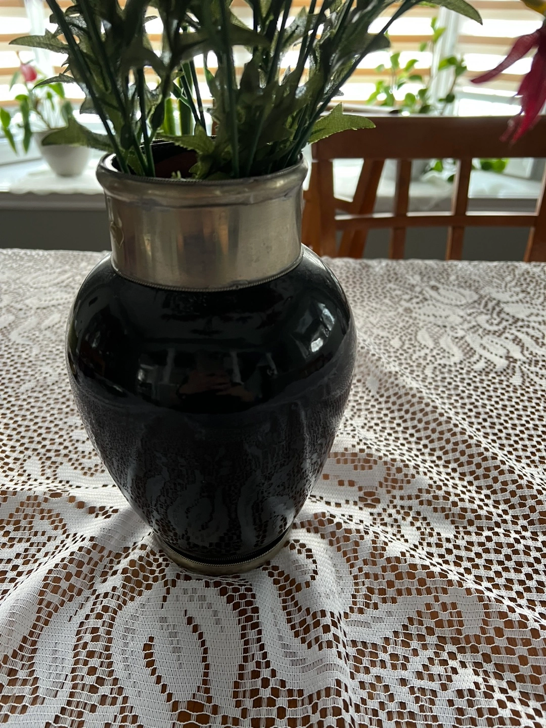 Black ceramic vase. Silver coloured metal band around the rim and base. Approximately 10 inches tall. Artificial flowers included.
