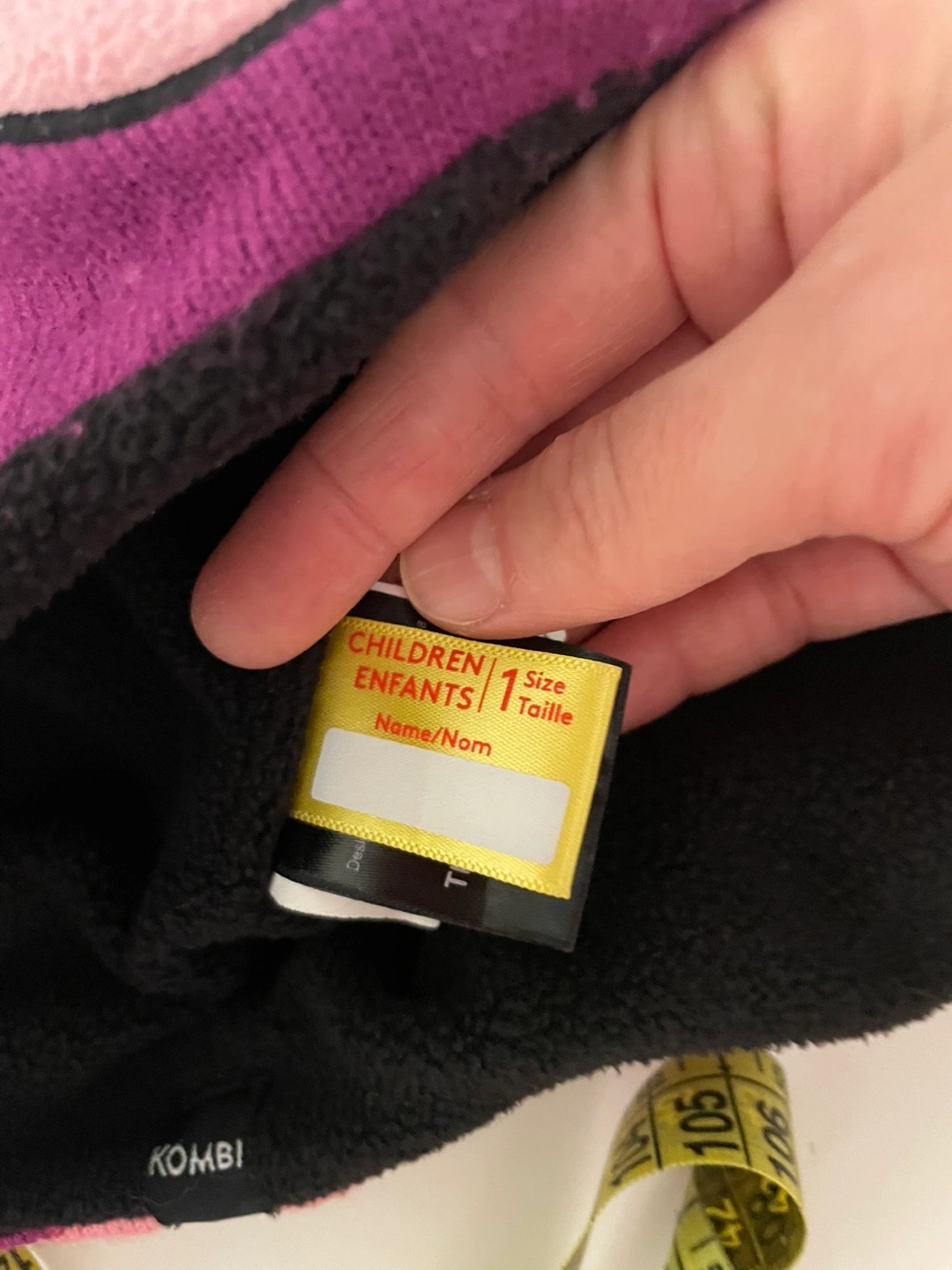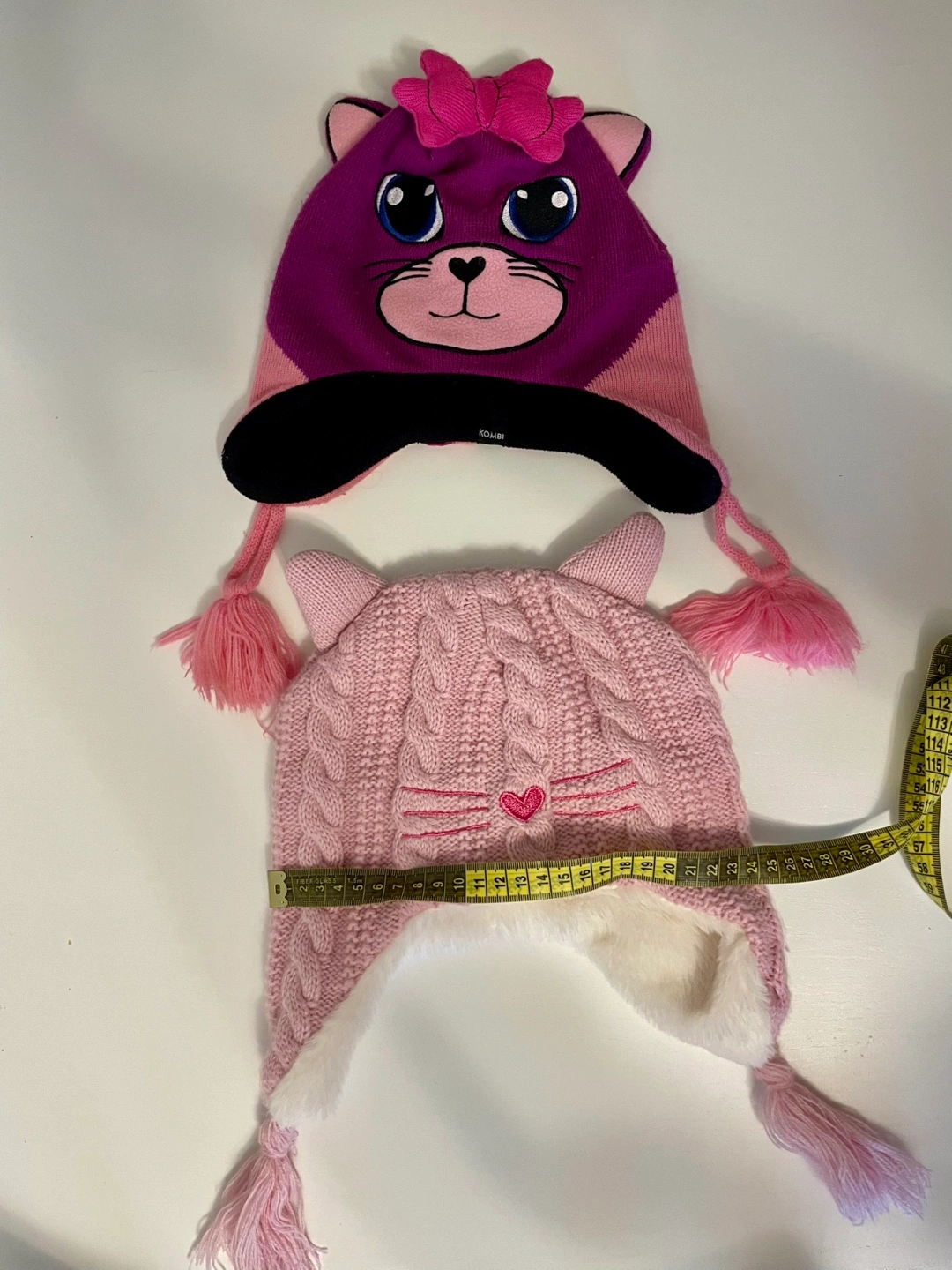 Set of two girls' winter hats. One purple cat-themed toque with a bow. Second hat pink cable knit with cat ears and a fluffy white brim. Both hats have tassels. Size 1. 8$ for BOTH