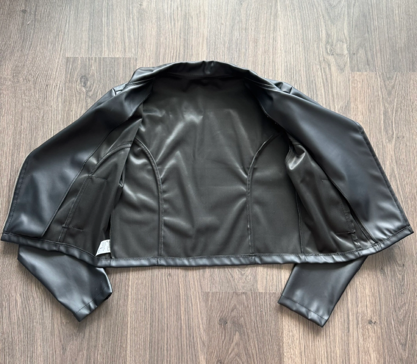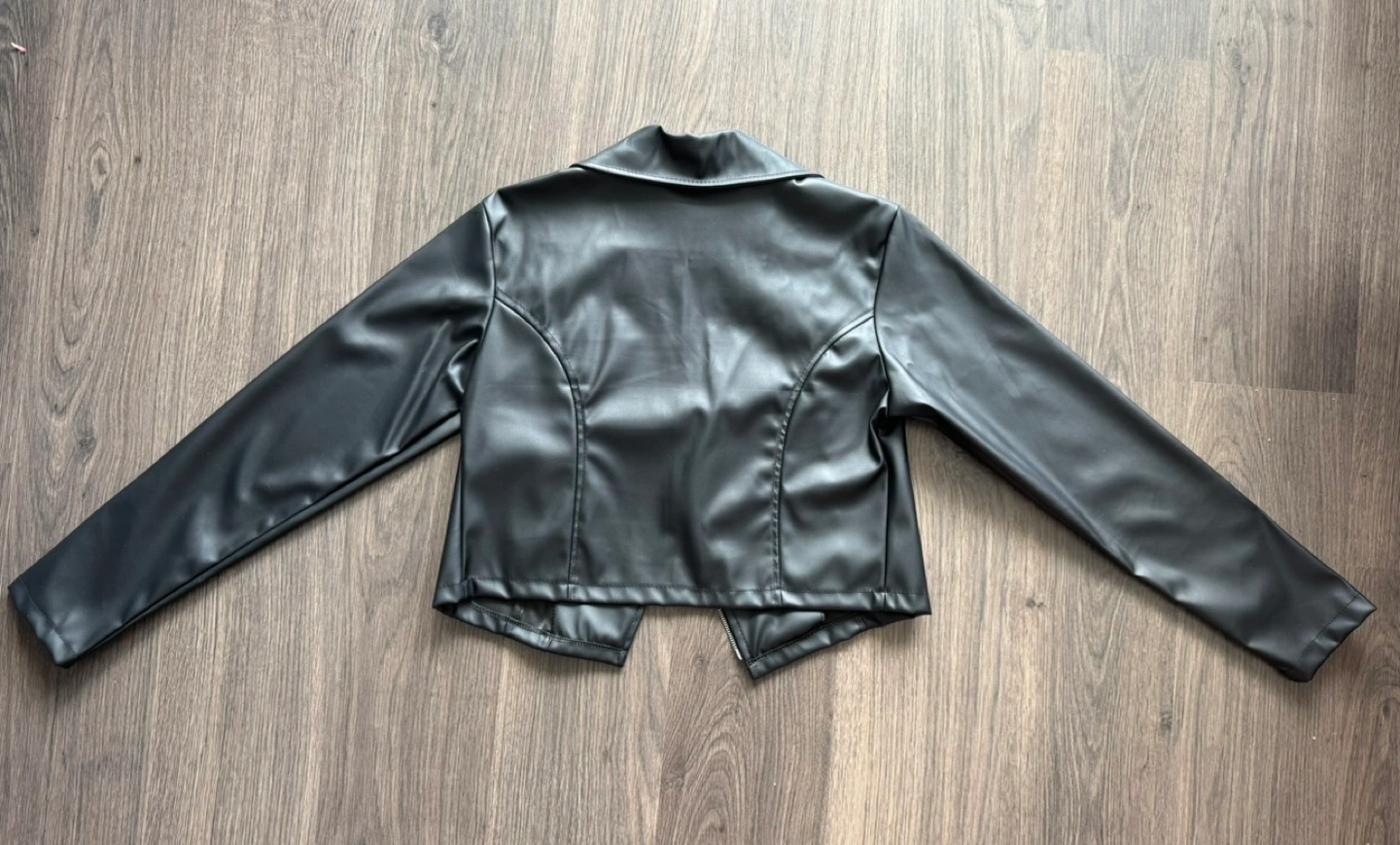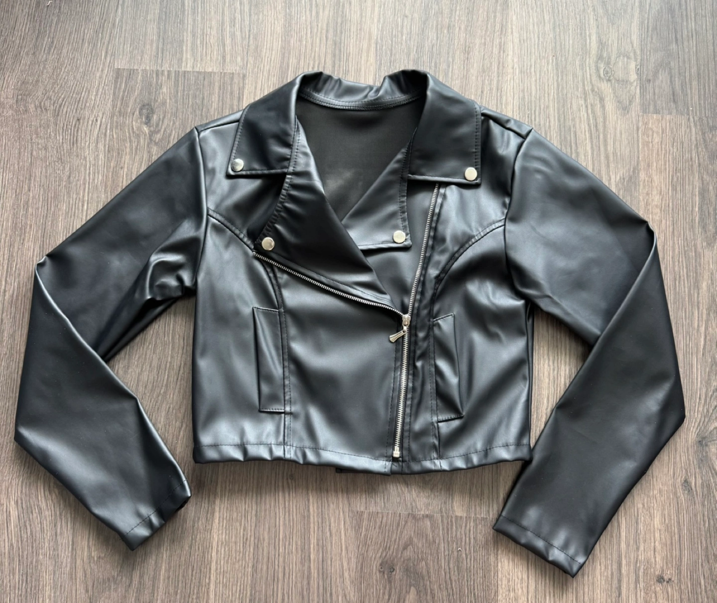 Women's cropped black faux leather jacket. Asymmetrical zipper. Long sleeves. Great for a stylish look.
