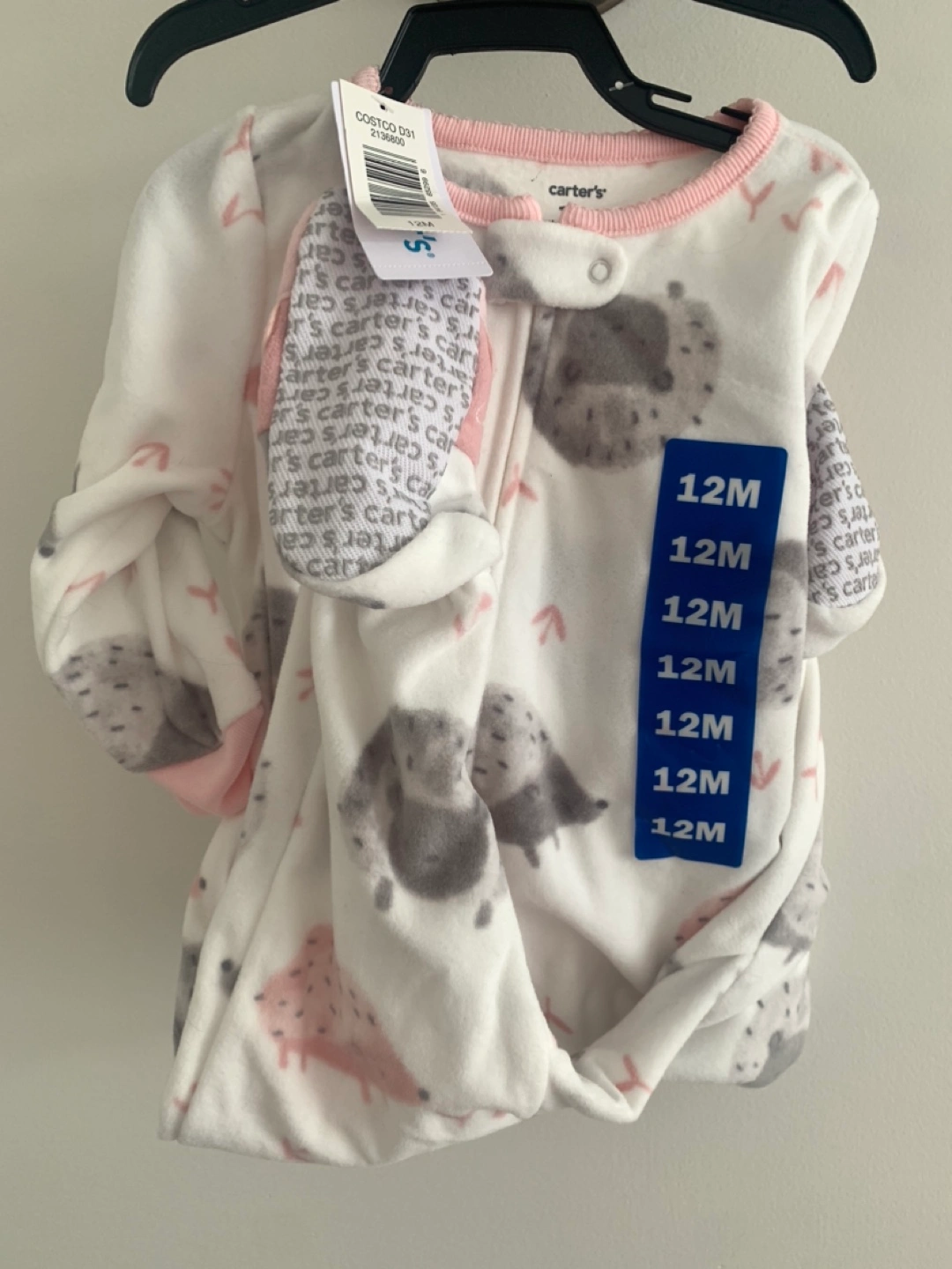 Adorable hedgehog print PJs. Soft fleece material. Size 12 months. Includes built-in footies. New with tags on.