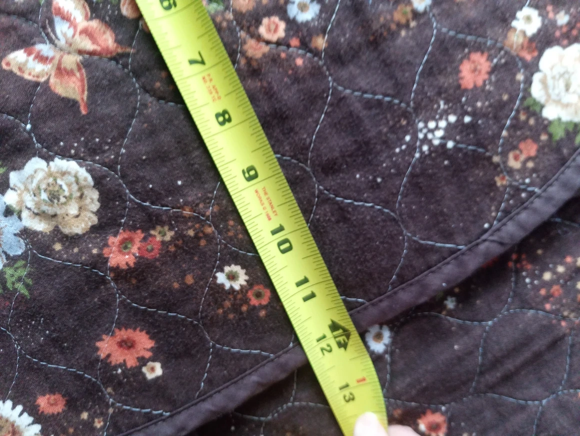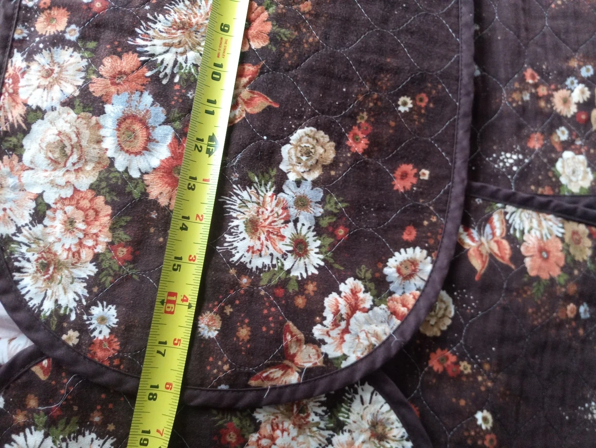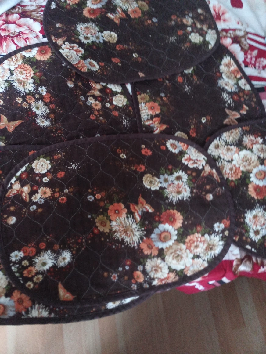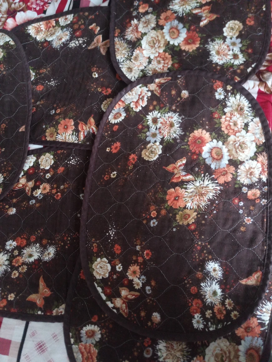 Set of six oval placemats. Brown background. Floral print with butterflies. Quilted fabric. Approximately 13"x 18". ,$10 for 6,