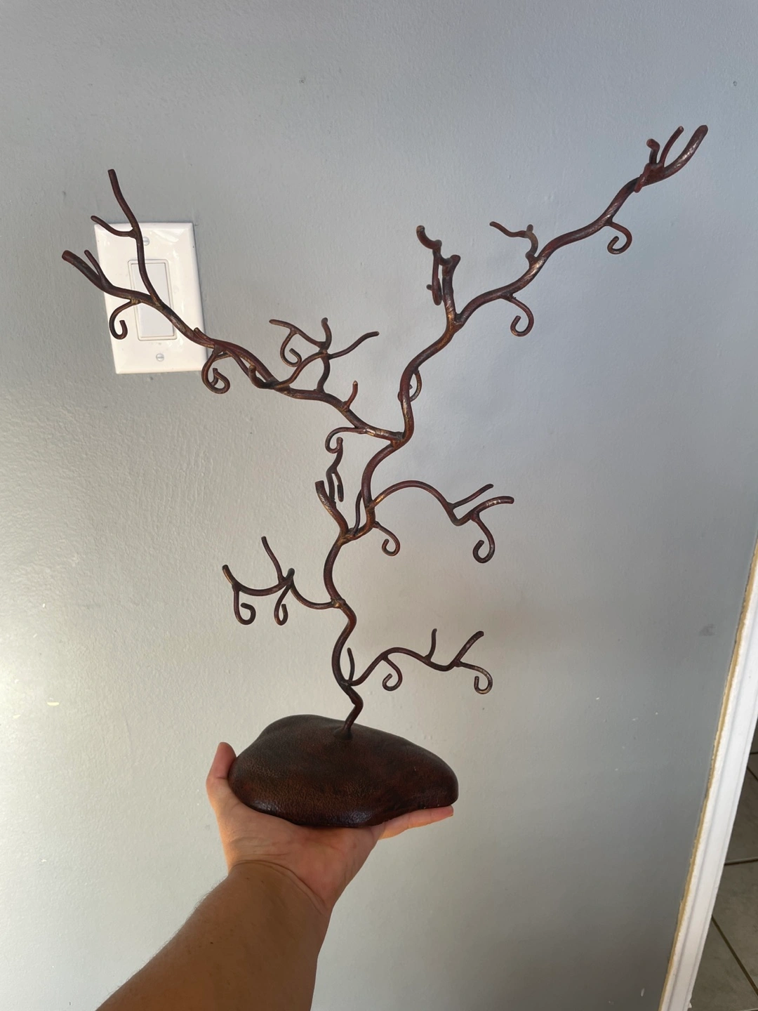 Unique metal jewellery holder. Features a dark brown finish. Looks like a small tree. Great for earrings and necklaces.