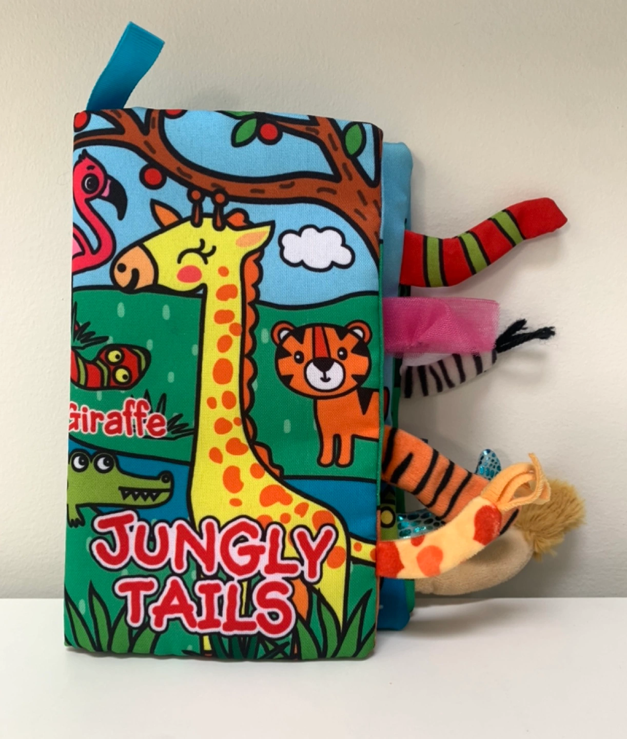 Soft book. Features various jungle animals. Multiple textured tails. Great for sensory play. Excellent condition.
