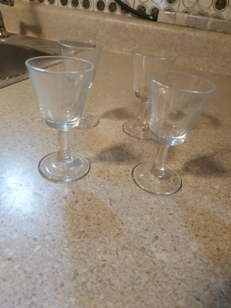 Four small clear glasses. Etched design. Stemmed base. Perfect for cordials or liquors.