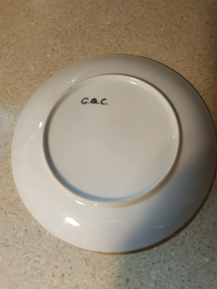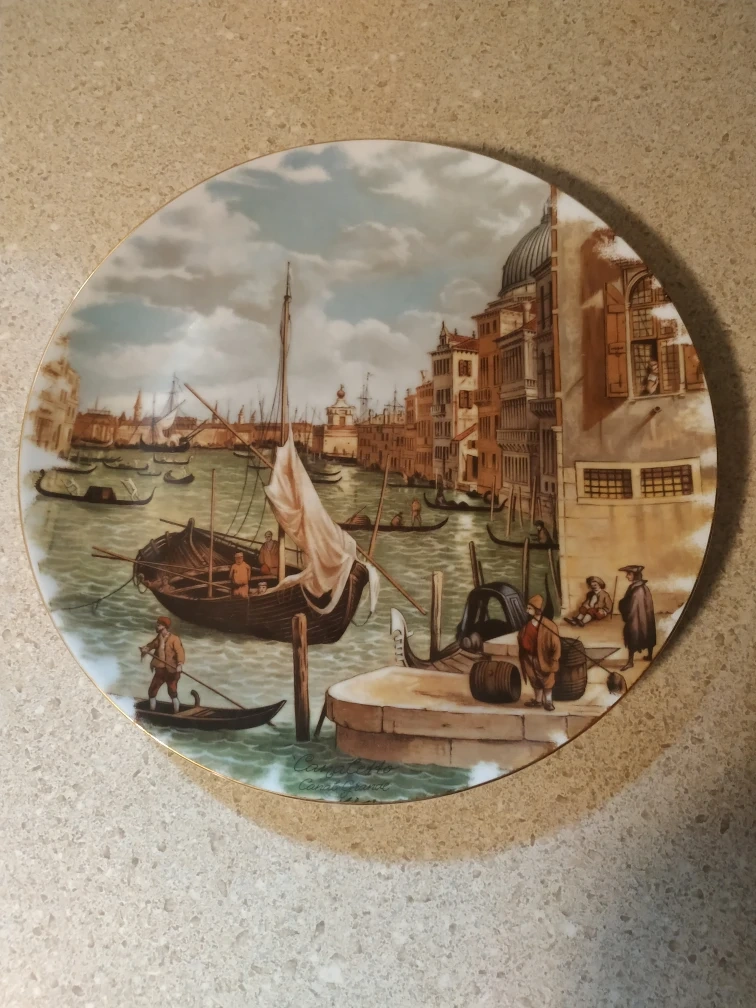 Beautiful decorative plate. Features a picturesque scene of the Venetian canals. Gold-trimmed edge. Measures 9 inches in diameter. G.Q.C. marking on the back.