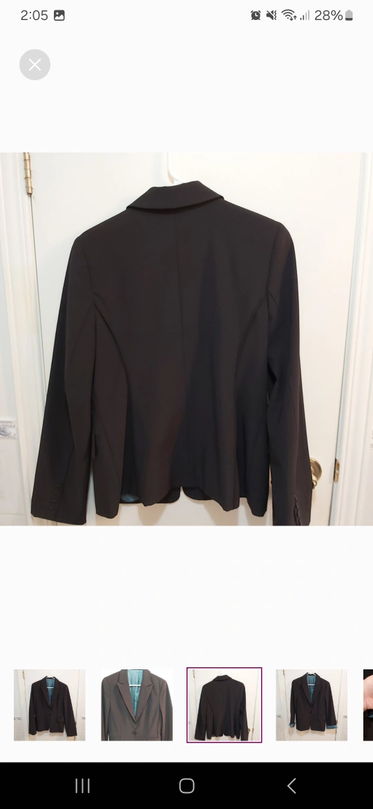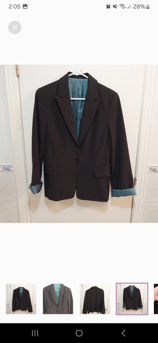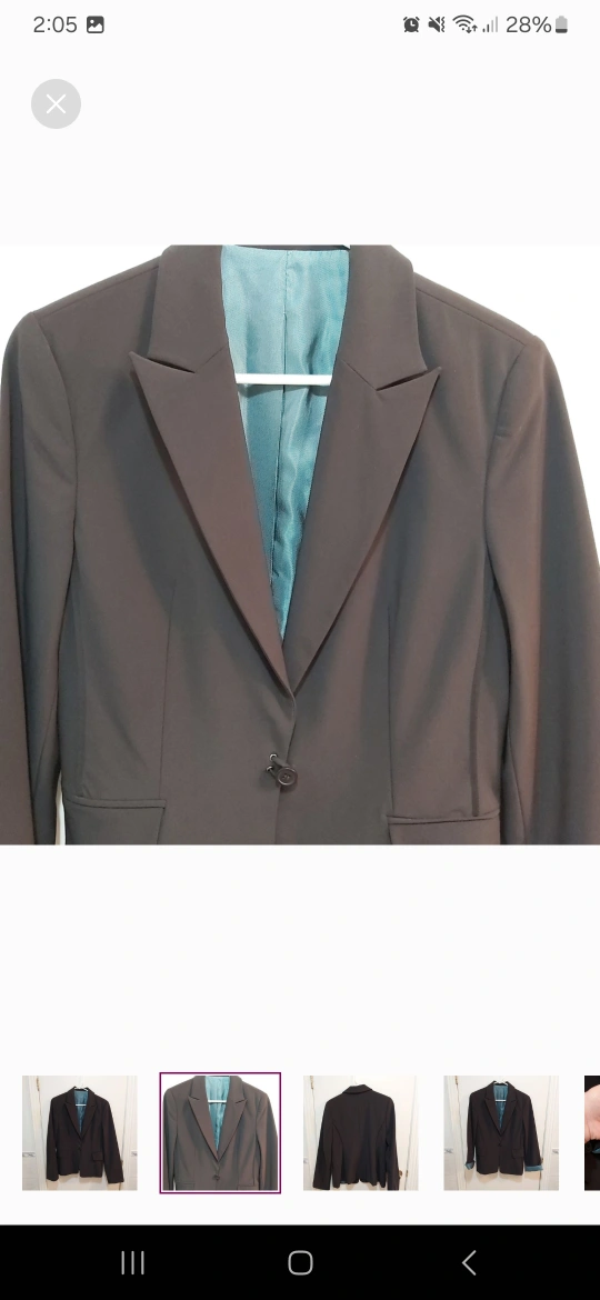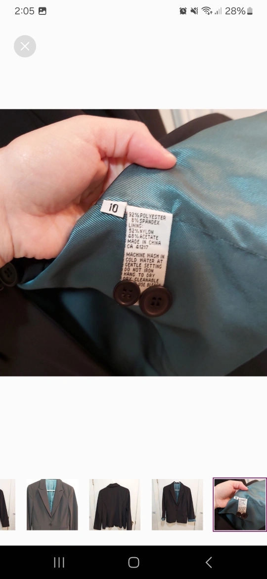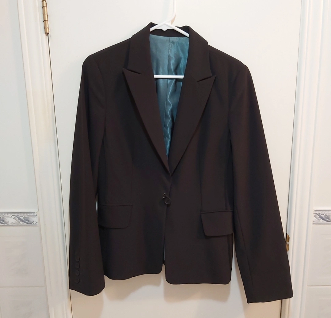 Brand: unknown Type: Vintage blazer jacket with one button that wraps around elastic like portion; beautiful blue inside. Great for formal events like weddings, work, etc Colour: Black exterior, blue interior Size: 10 Composition/material: 92% polyester and 8% spandex; lining is 52% nylon and 48% acetate Additional measurements: 65 cm length, around 48 cm pit to pit Condition: Excellent