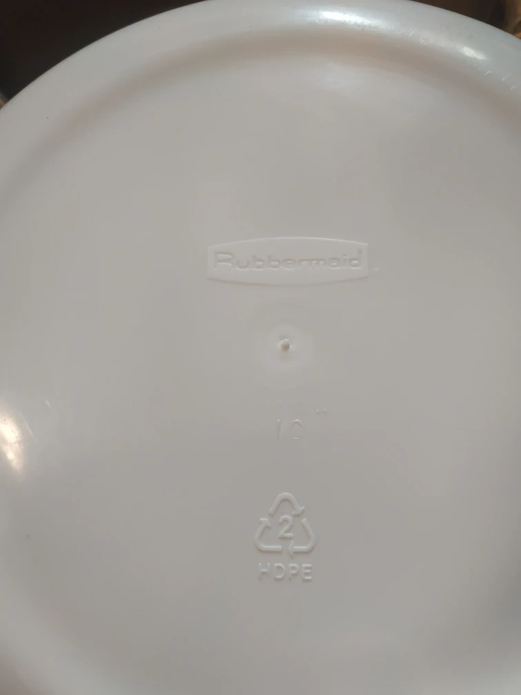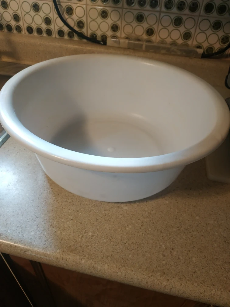 Large white plastic basin. Great for washing and other household uses. Measures approximately 15 inches in diameter.
