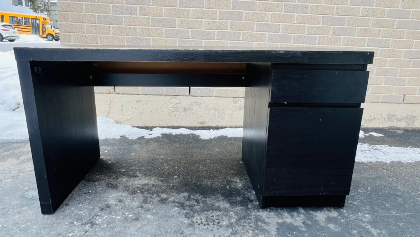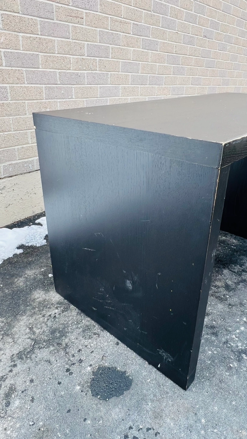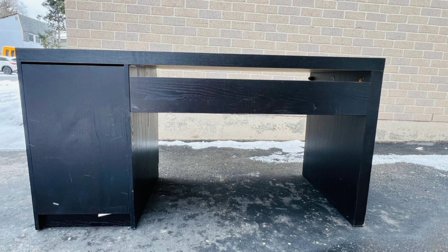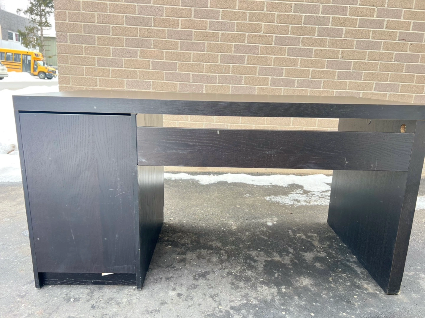 Simple black desk. Features one drawer and one cabinet. Good for small spaces. Some minor wear. Size approx. - 60 inches * 27 inches * H 30 inches. Used as study table, side table, garage uses or kitchens use.