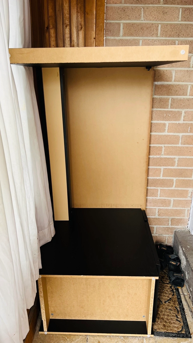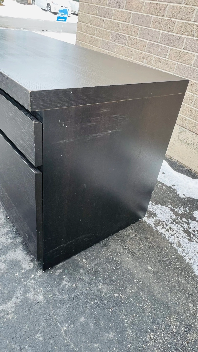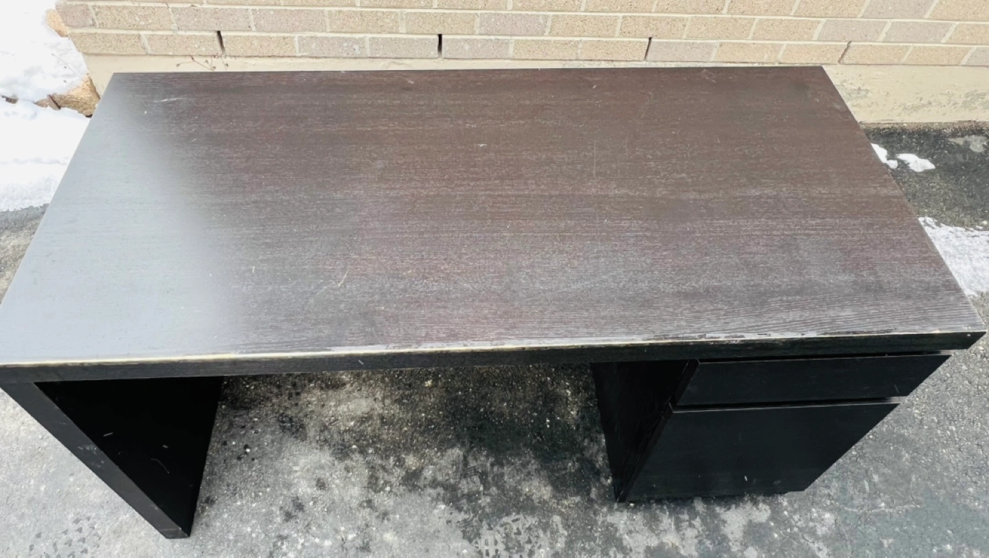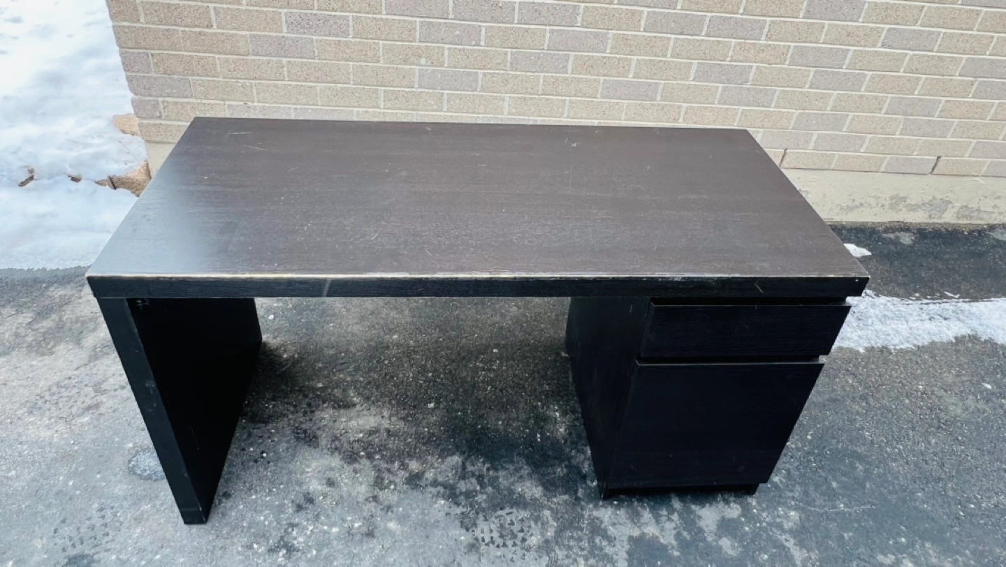 Simple black desk. Features one drawer and one cabinet. Good for small spaces. Some minor wear. Size approx. - 60 inches * 27 inches * H 30 inches. Used as study table, side table, garage uses or kitchens use.