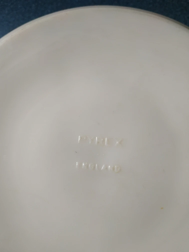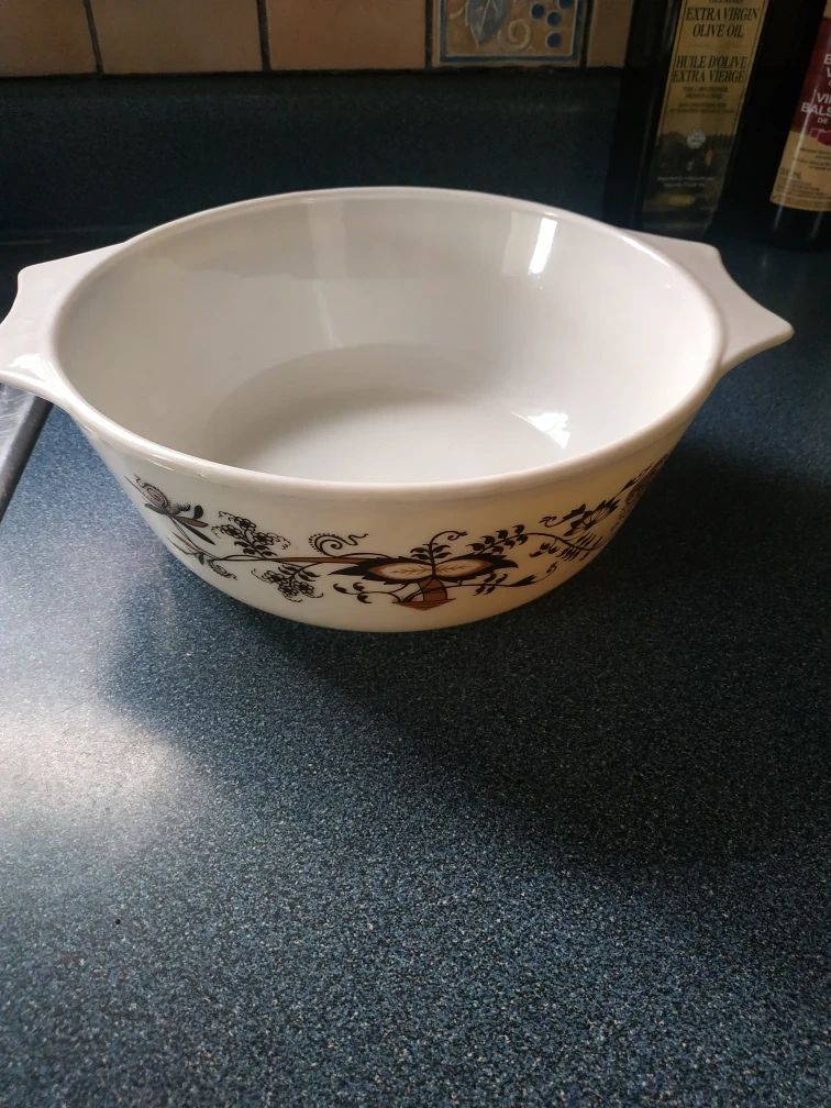 Large vintage Pyrex casserole dish. Brown floral pattern. Measures 9 inches across. Made in England.