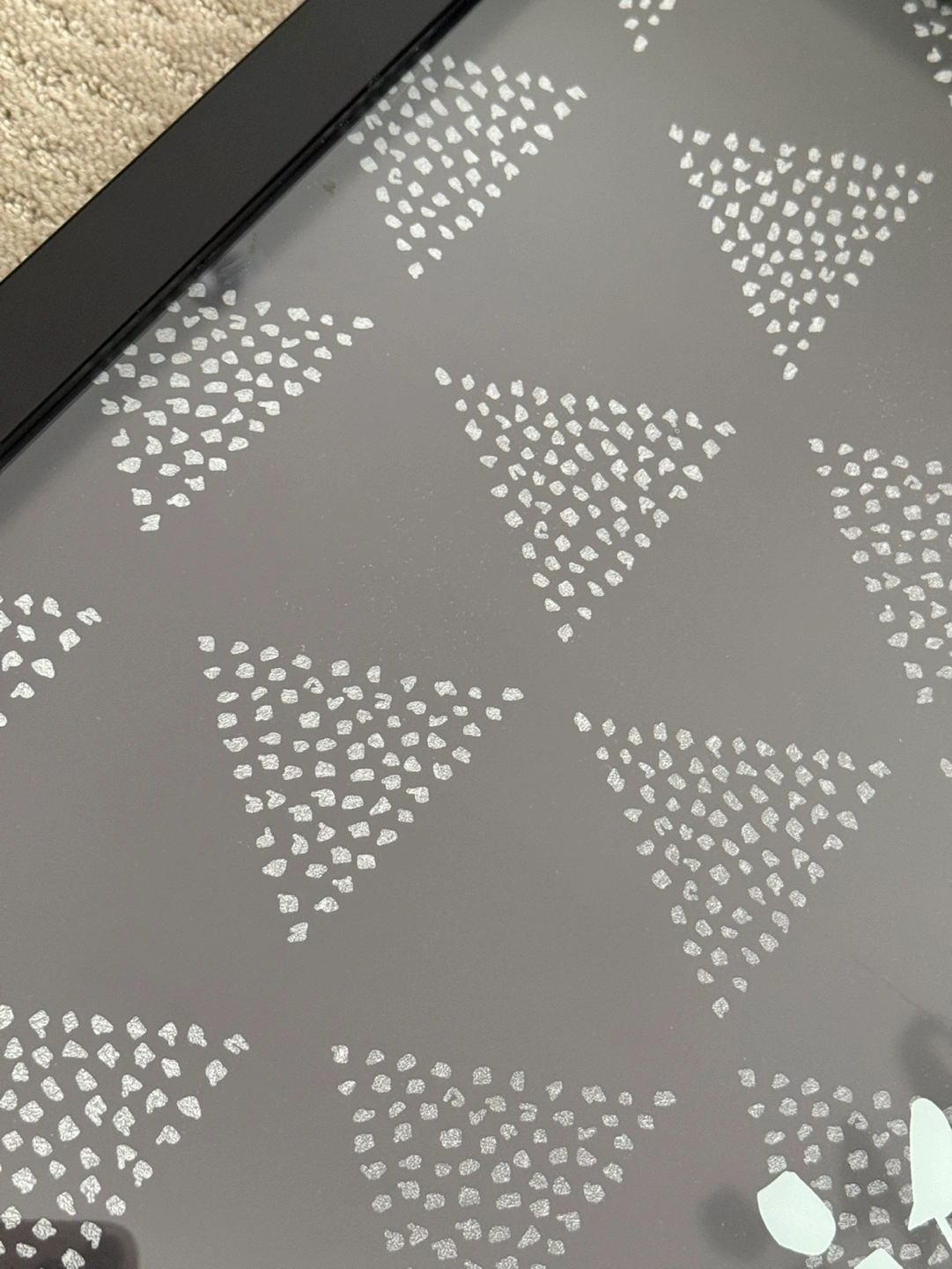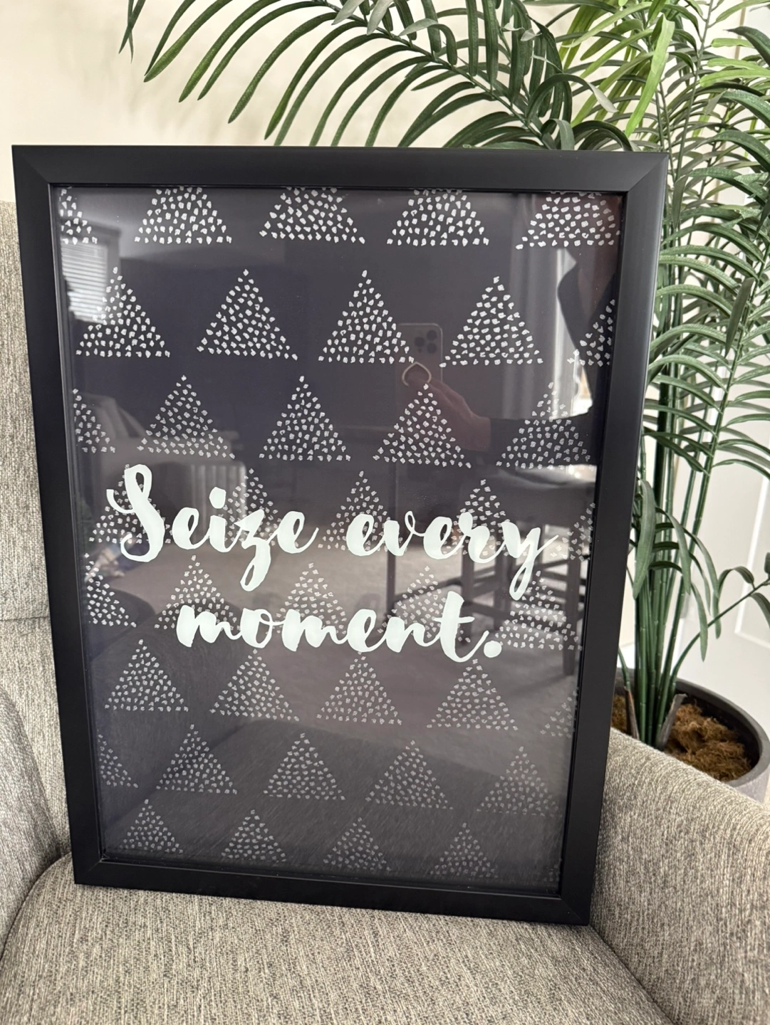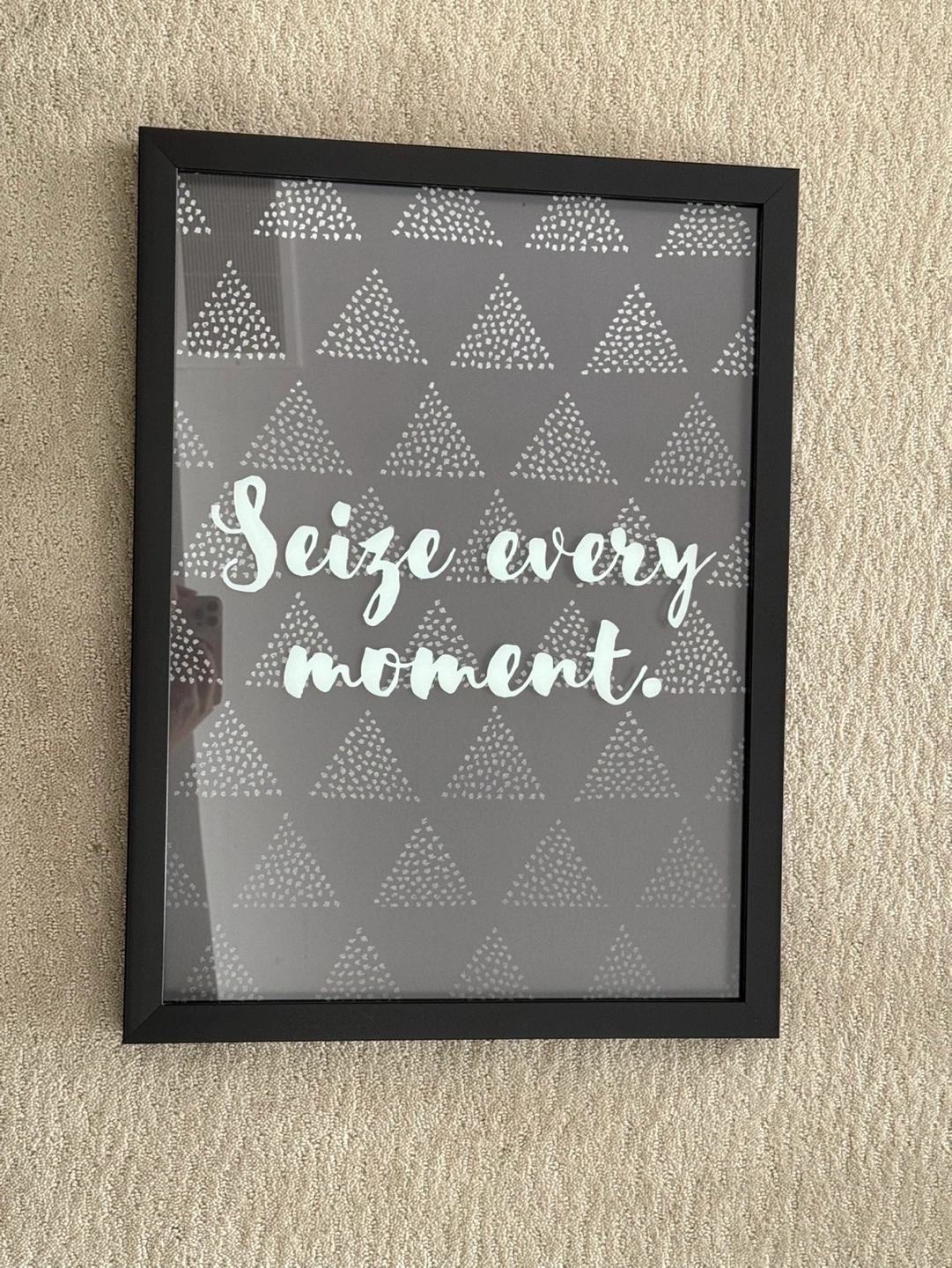 Framed print featuring the quote "Seize every moment." Black background with a white triangle pattern. Black frame. Perfect for home décor.